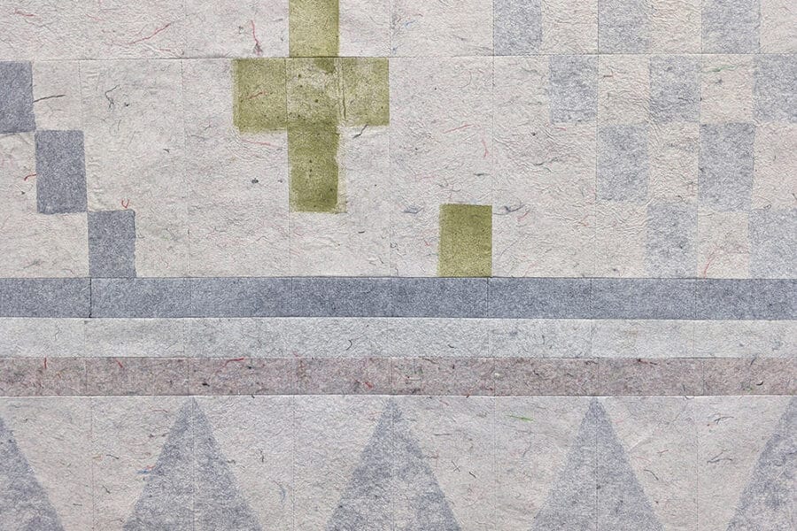 Runner Work RunnerRunner (detail) 2024 cotton workcoats, Arena cardigan, Regeneracija recycled floor coverings, park grass, thread 500mm…Marielle MacLeman25 February 2026