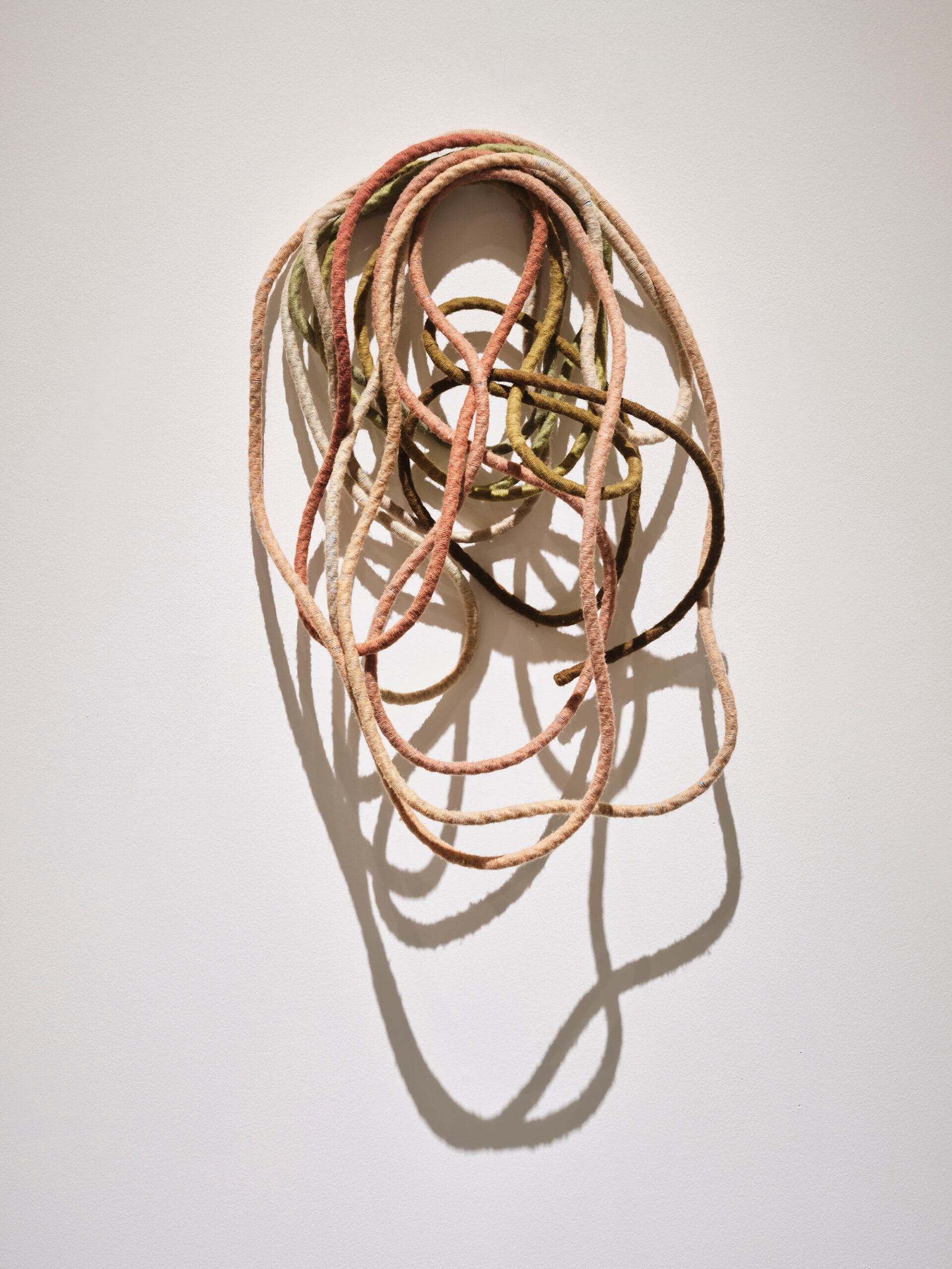 Reflecting on the reputation of ivy to take over and undermine trees, Climber clads the blue polypropylene rope commonly used in the forestry industry with wool dyed using birch bark and ivy harvested from toppled trees and walls in the wake of storms. A gradient of colours was achieved over the single length of rope by exhausting dye pots to give continuously lighter shades of wool, then using mordant afterbaths to adjust these colours, followed by a process of careful grading.