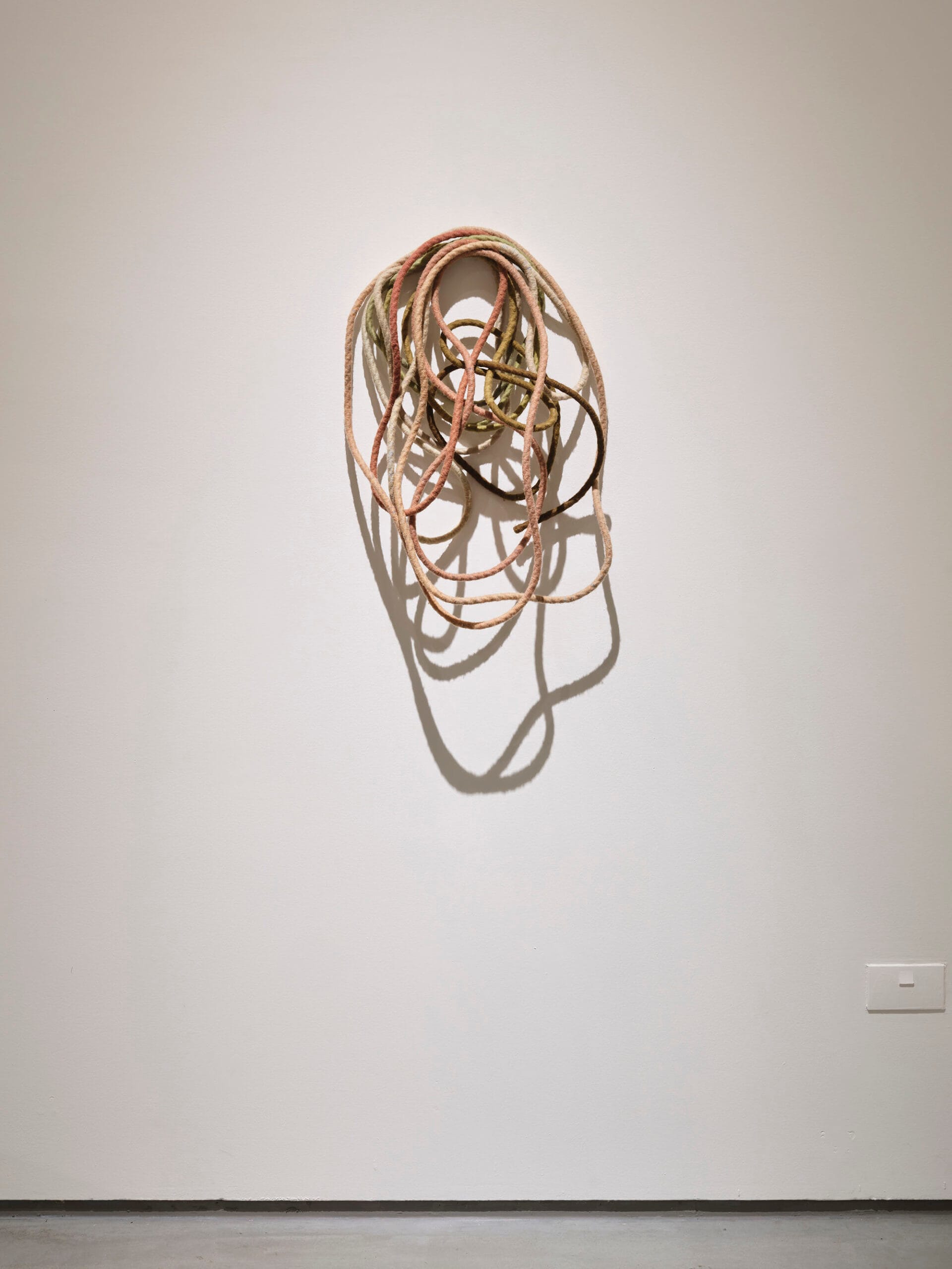 Reflecting on the reputation of ivy to take over and undermine trees, Climber clads the blue polypropylene rope commonly used in the forestry industry with wool dyed using birch bark and ivy harvested from toppled trees and walls in the wake of storms. A gradient of colours was achieved over the single length of rope by exhausting dye pots to give continuously lighter shades of wool, then using mordant afterbaths to adjust these colours, followed by a process of careful grading.