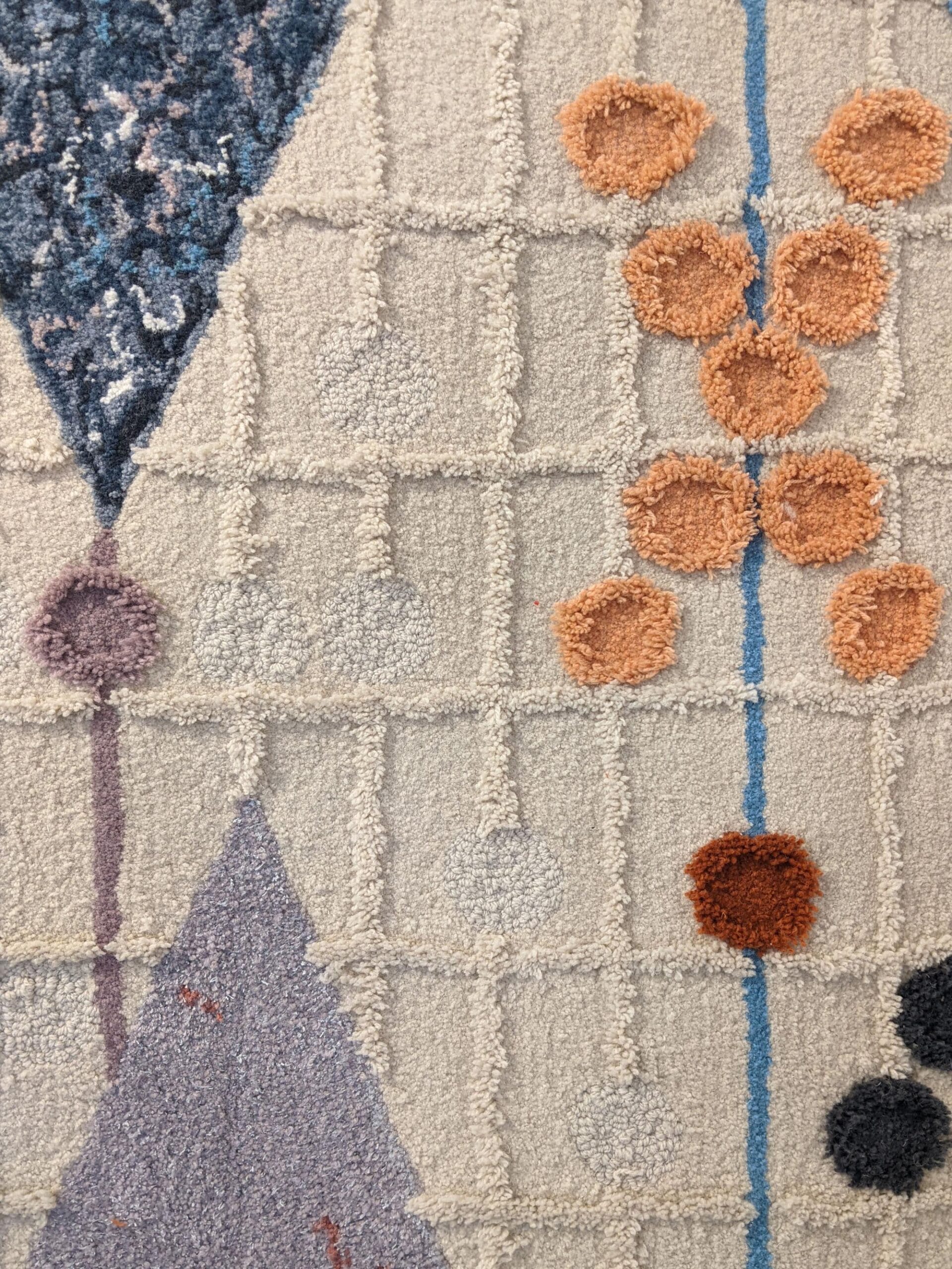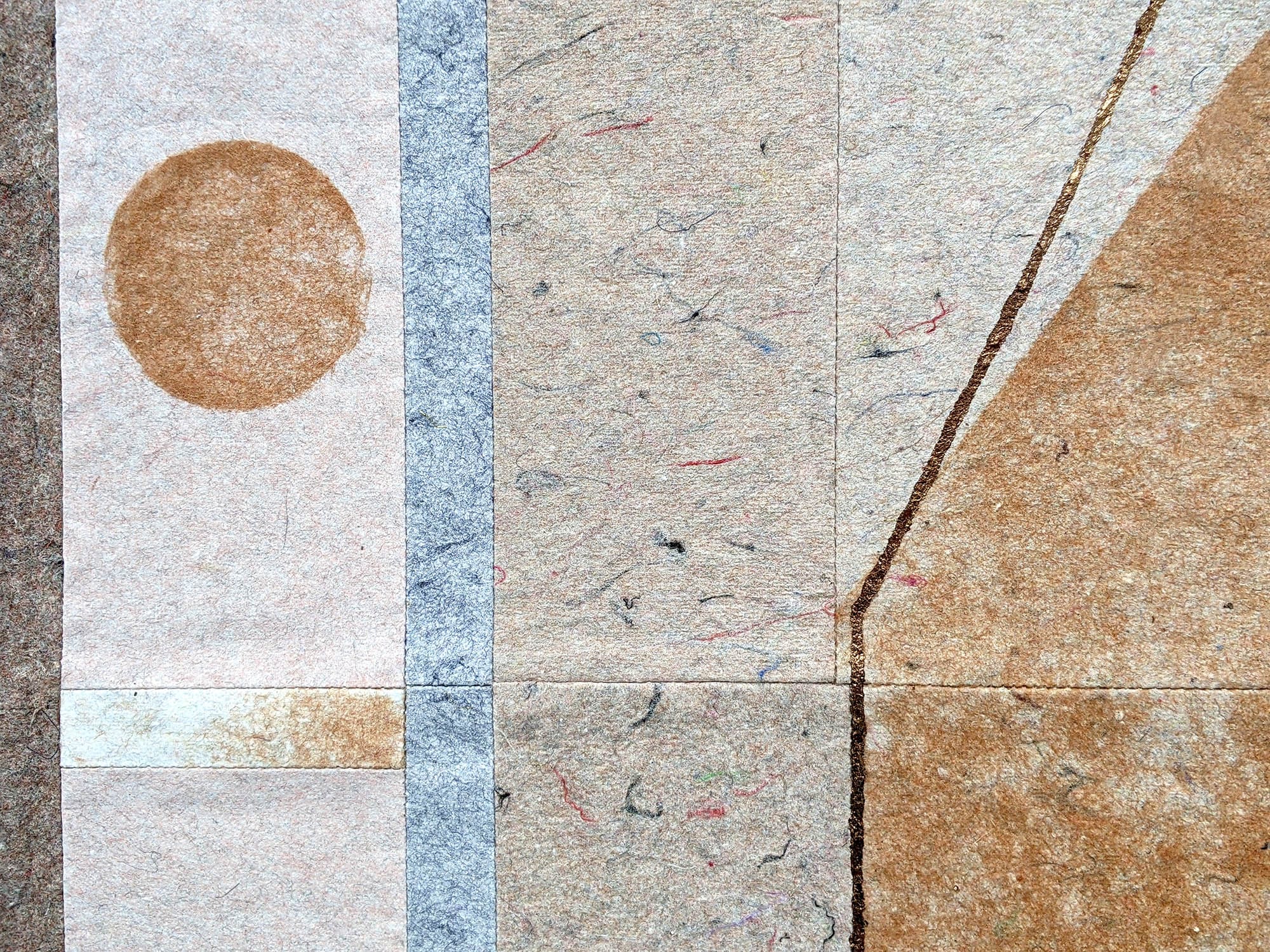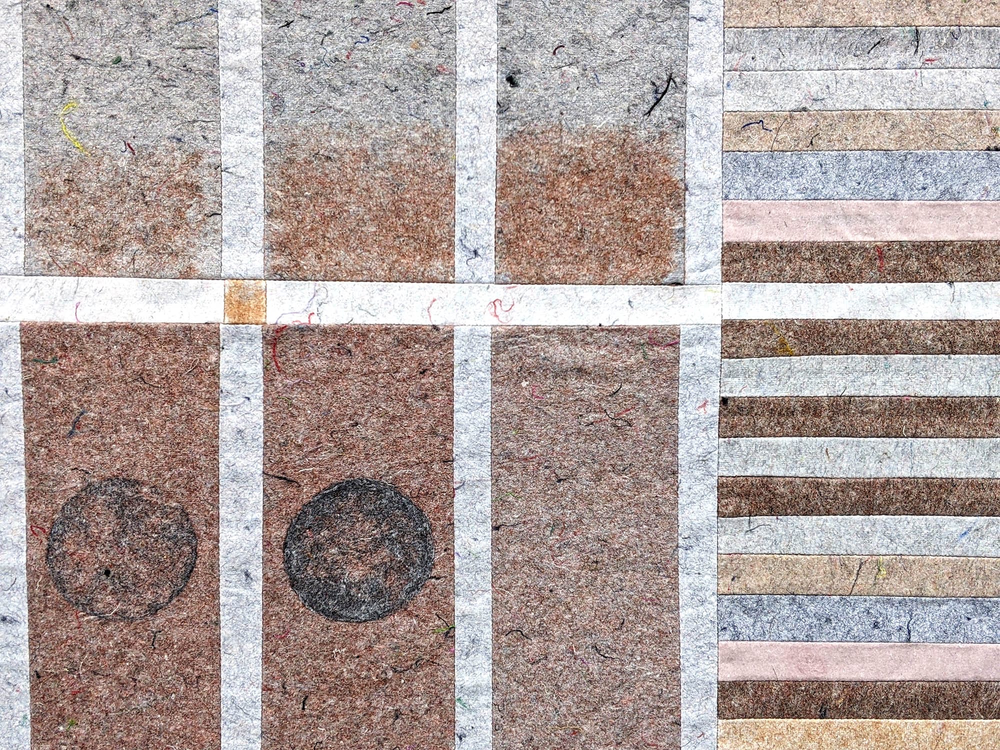 For the collaboration, ReGalerija tufted my composition for an artwork using only the surplus wool from previous projects and I used papermaking processes to incorporate dust shorn from the same with Regeneracija’s recycled floorcovering – a composite material made from the offcuts of European garment production and secondhand clothing. Both artworks visually reference the shuttles and punched cards of textile production. The design of the rug varies loop and cut pile to interperate the textures of weaving and enlarged details of Regeneracija’s floorcovering. The flecks of lamé and sequins that pepper this product, inspired the use of variegated metal leaf on my signature reconstituted ‘cloth’ patchwork, coined by CIMO as ‘mosaic wall paintings’.