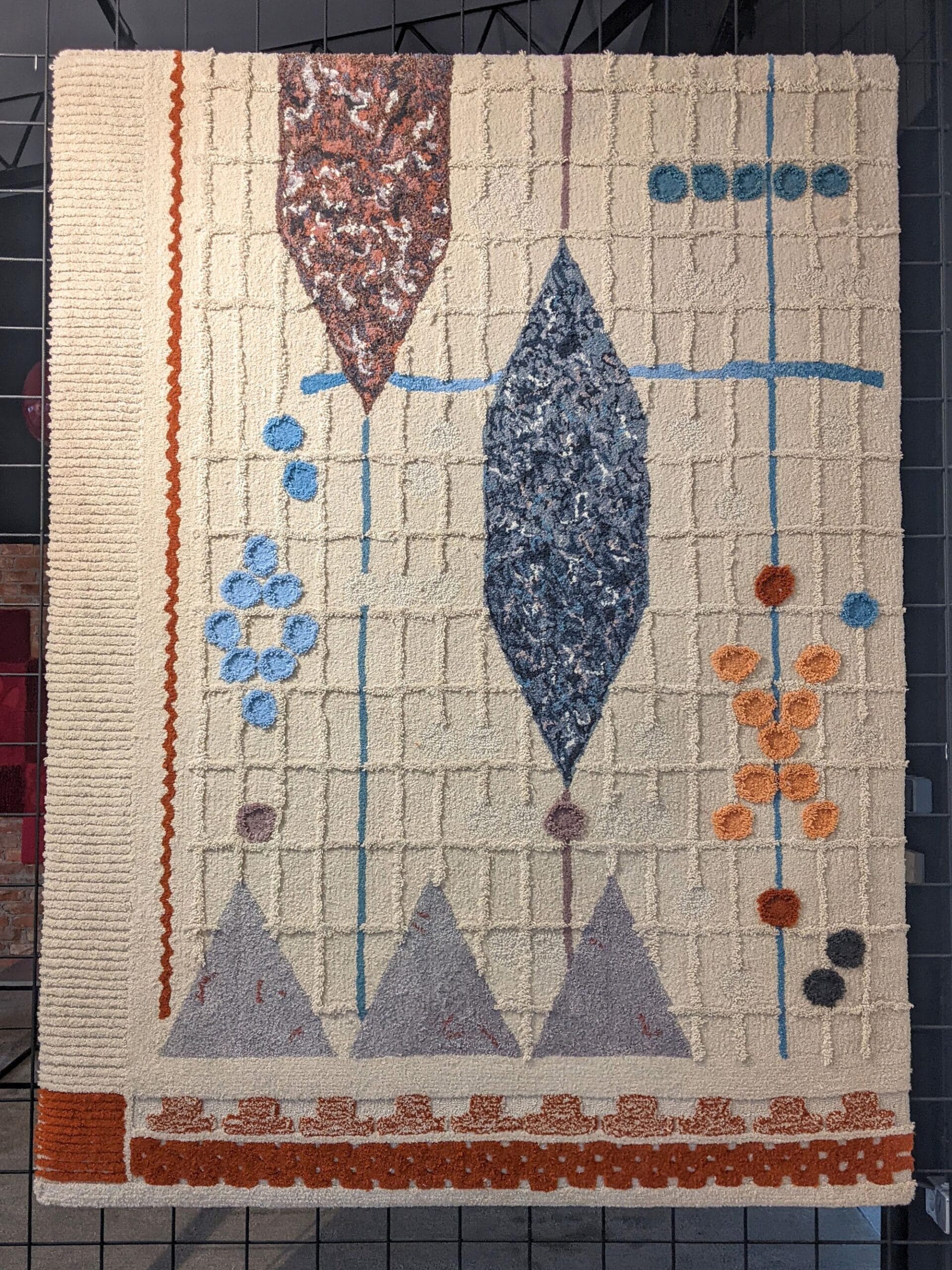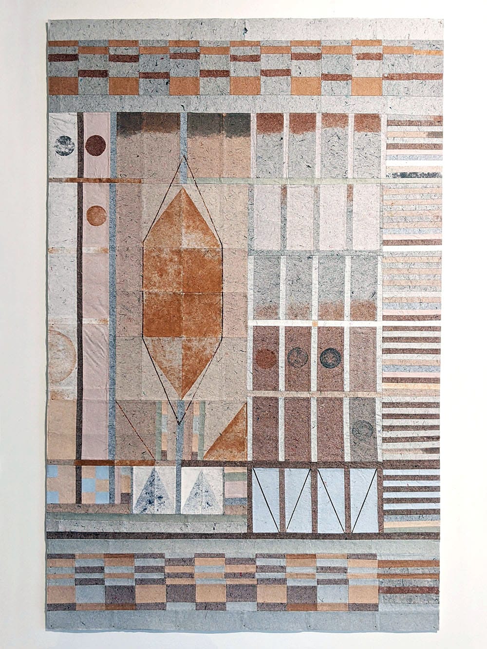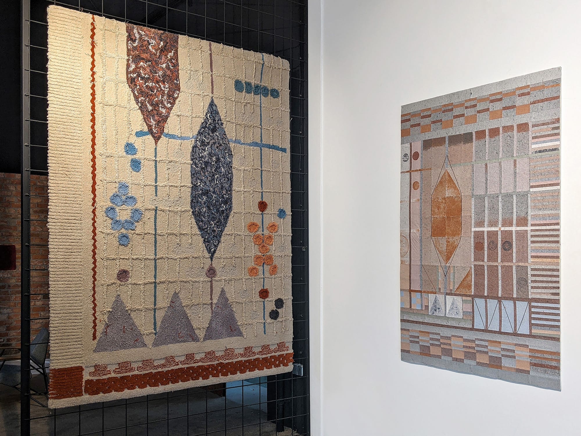 For the collaboration, ReGalerija tufted my composition for an artwork using only the surplus wool from previous projects and I used papermaking processes to incorporate dust shorn from the same with Regeneracija’s recycled floorcovering – a composite material made from the offcuts of European garment production and secondhand clothing. Both artworks visually reference the shuttles and punched cards of textile production. The design of the rug varies loop and cut pile to interperate the textures of weaving and enlarged details of Regeneracija’s floorcovering. The flecks of lamé and sequins that pepper this product, inspired the use of variegated metal leaf on my signature reconstituted ‘cloth’ patchwork, coined by CIMO as ‘mosaic wall paintings’.