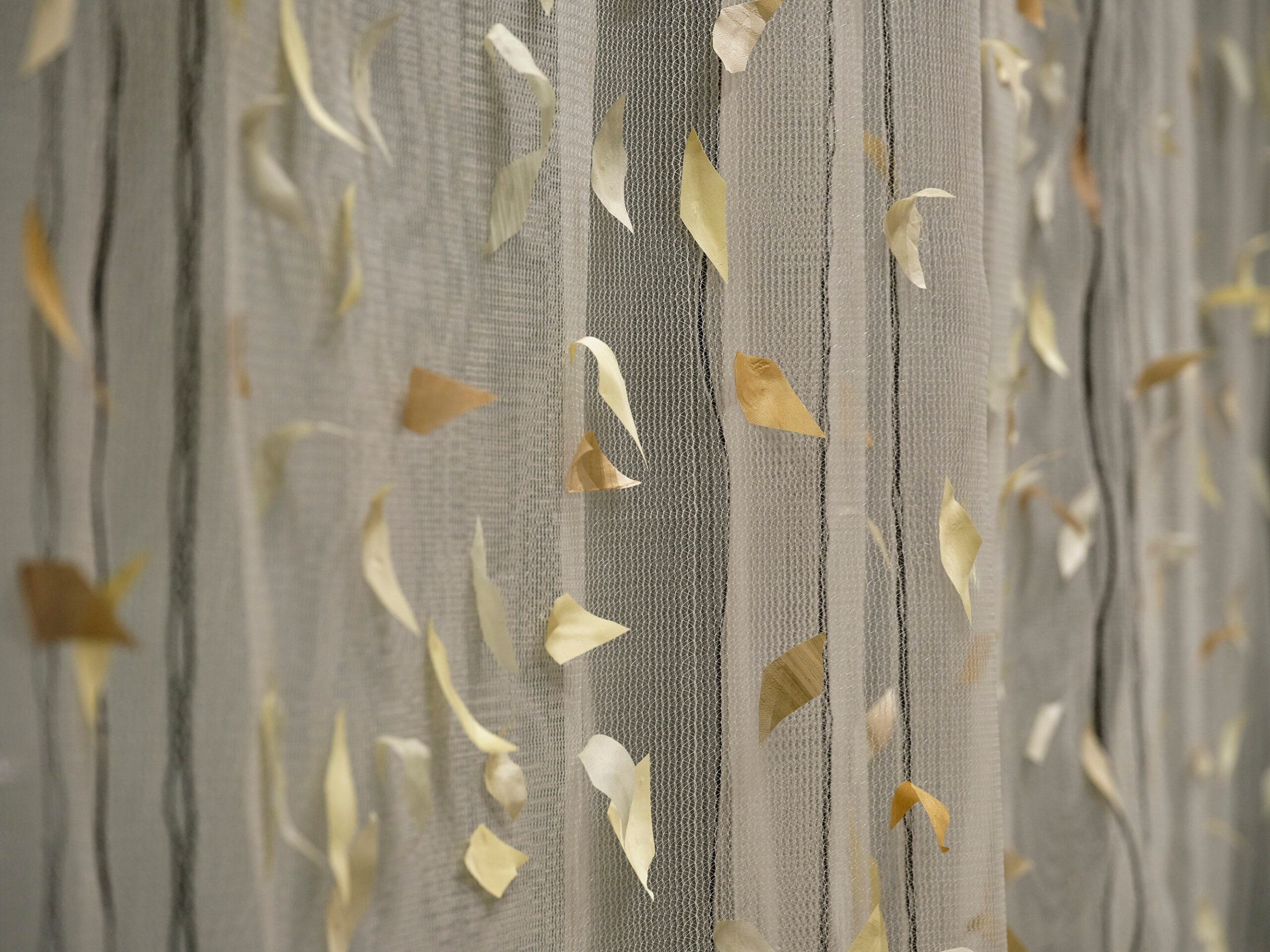 Inspired by the ivy-clad fronts of ruins and scientific prediction that the evergreen will prevail over deciduous plants in the grip of climate change, Façade floats like an emblematic tipping point. Debris netting – a material of both exclusion and protection, urban renewal and ruin – forms a lace-like net curtain, embellished with ‘leaves’ made from reclaimed curtains dyed with ivy collected from walls and trees toppled in storms. Ivy embodies similar duality – a ubiquitous underminer of walls and trees yet, at some point, an essential stabiliser of their rotting remains. During the exhibition run of The Visitors at Butler Gallery, I added more silk leaves dyed with ivy harvested in the wake of storms. These additions were evident both on the netting and in the shadows cast on the gallery floor. This is an ongoing work with more silk leaves added for subsequent shows, their colours given by the dye pots gleaned from future storms.