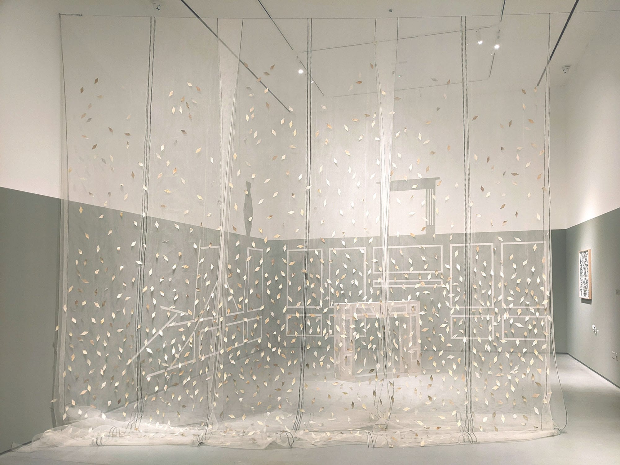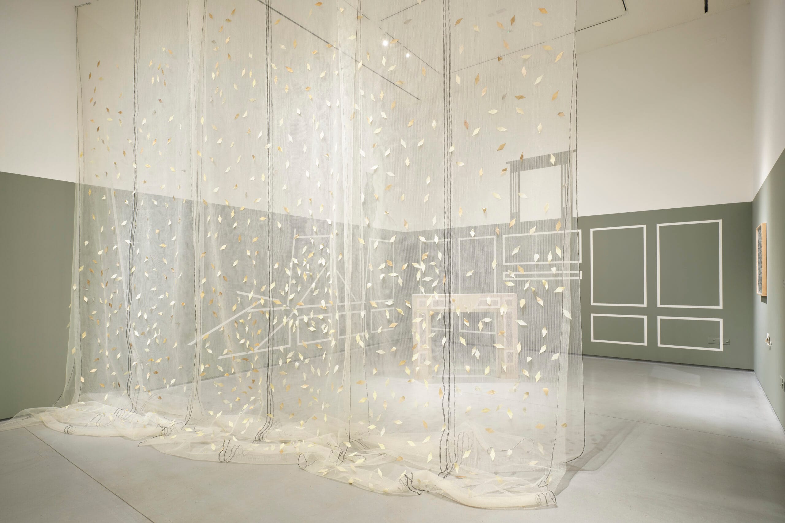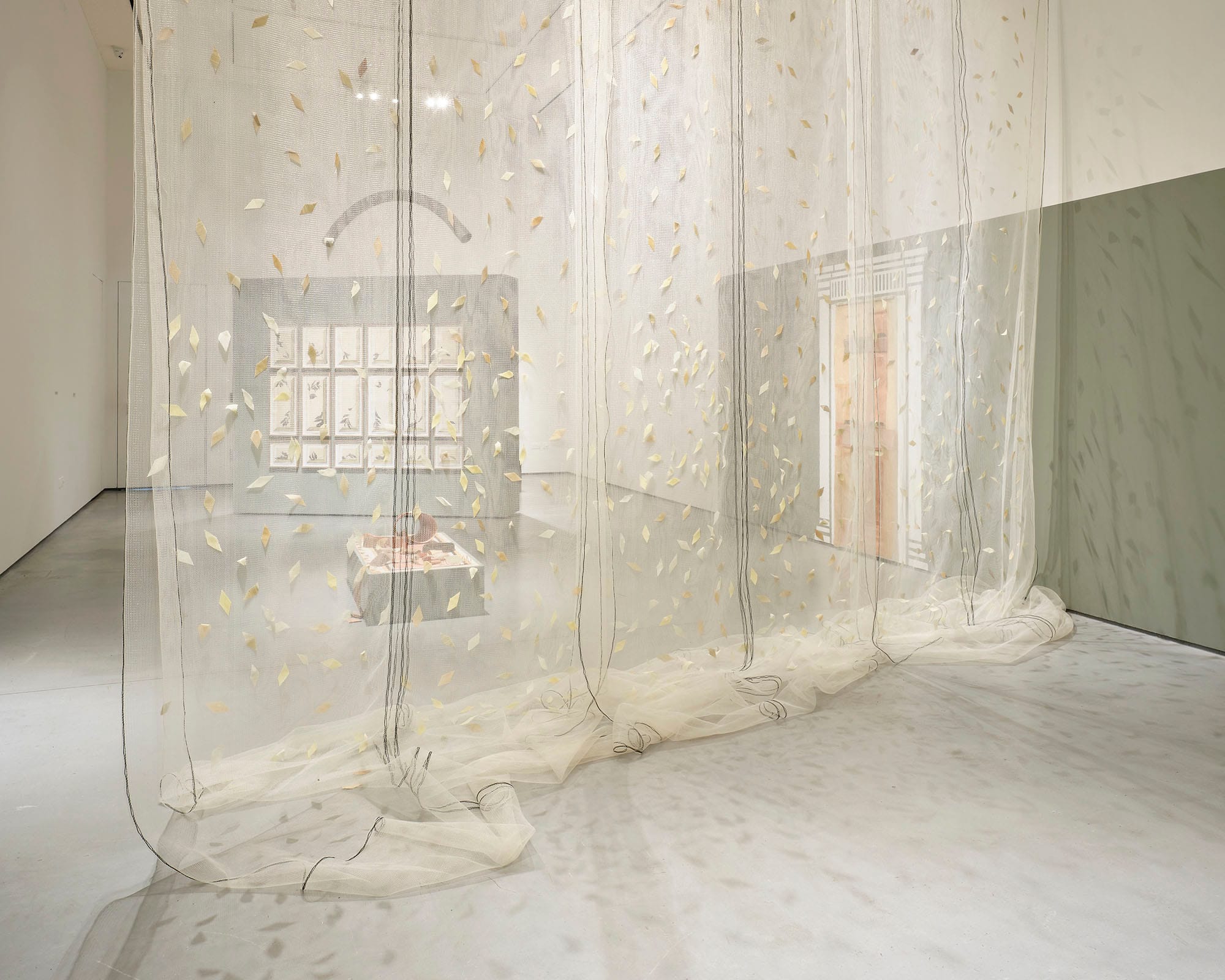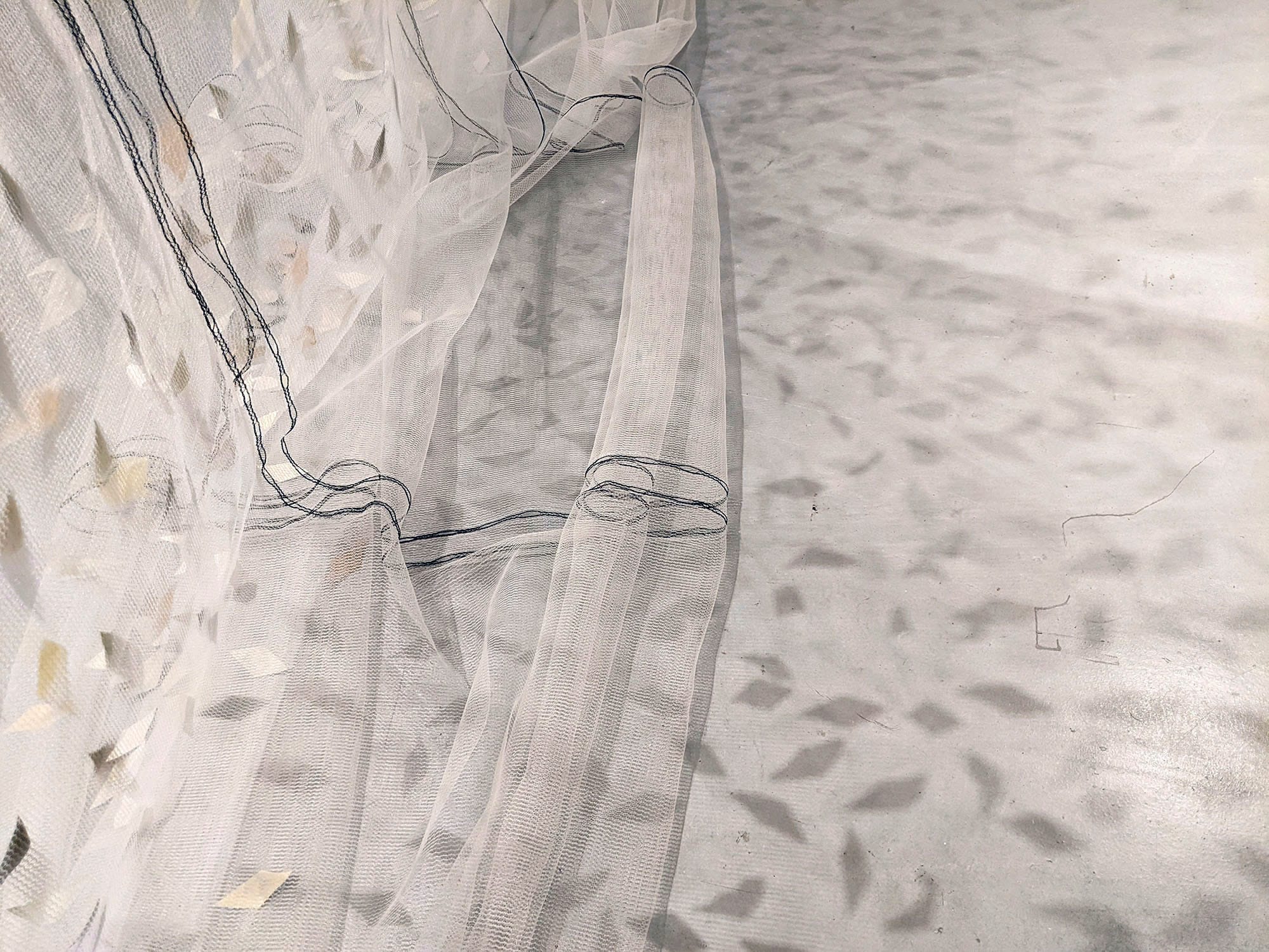 Inspired by the ivy-clad fronts of ruins and scientific prediction that the evergreen will prevail over deciduous plants in the grip of climate change, Façade floats like an emblematic tipping point. Debris netting – a material of both exclusion and protection, urban renewal and ruin – forms a lace-like net curtain, embellished with ‘leaves’ made from reclaimed curtains dyed with ivy collected from walls and trees toppled in storms. Ivy embodies similar duality – a ubiquitous underminer of walls and trees yet, at some point, an essential stabiliser of their rotting remains. During the exhibition run of The Visitors at Butler Gallery, I added more silk leaves dyed with ivy harvested in the wake of storms. These additions were evident both on the netting and in the shadows cast on the gallery floor. This is an ongoing work with more silk leaves added for subsequent shows, their colours given by the dye pots gleaned from future storms.