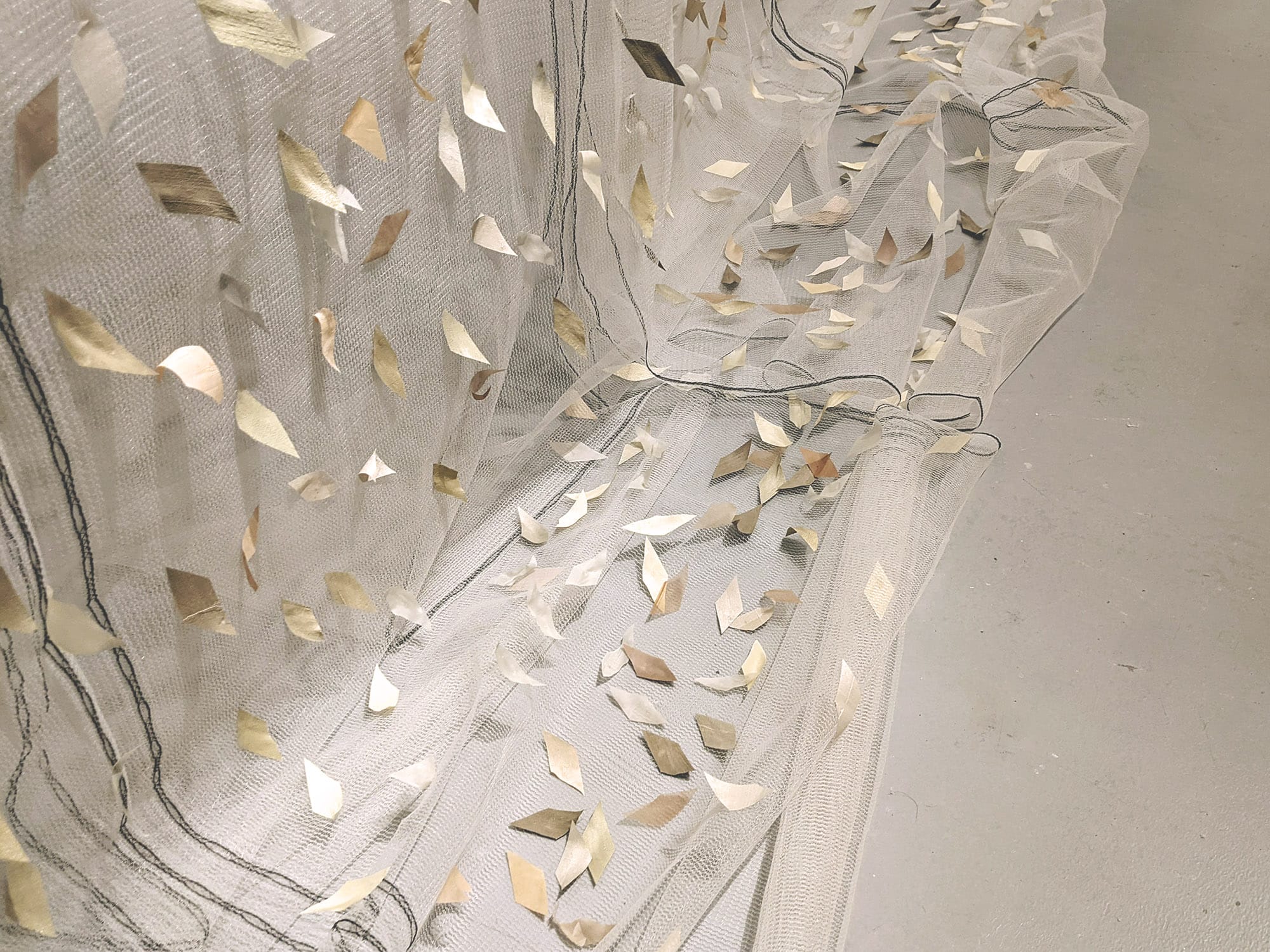 debris netting, reclaimed silk curtains, ivy dye, mordants