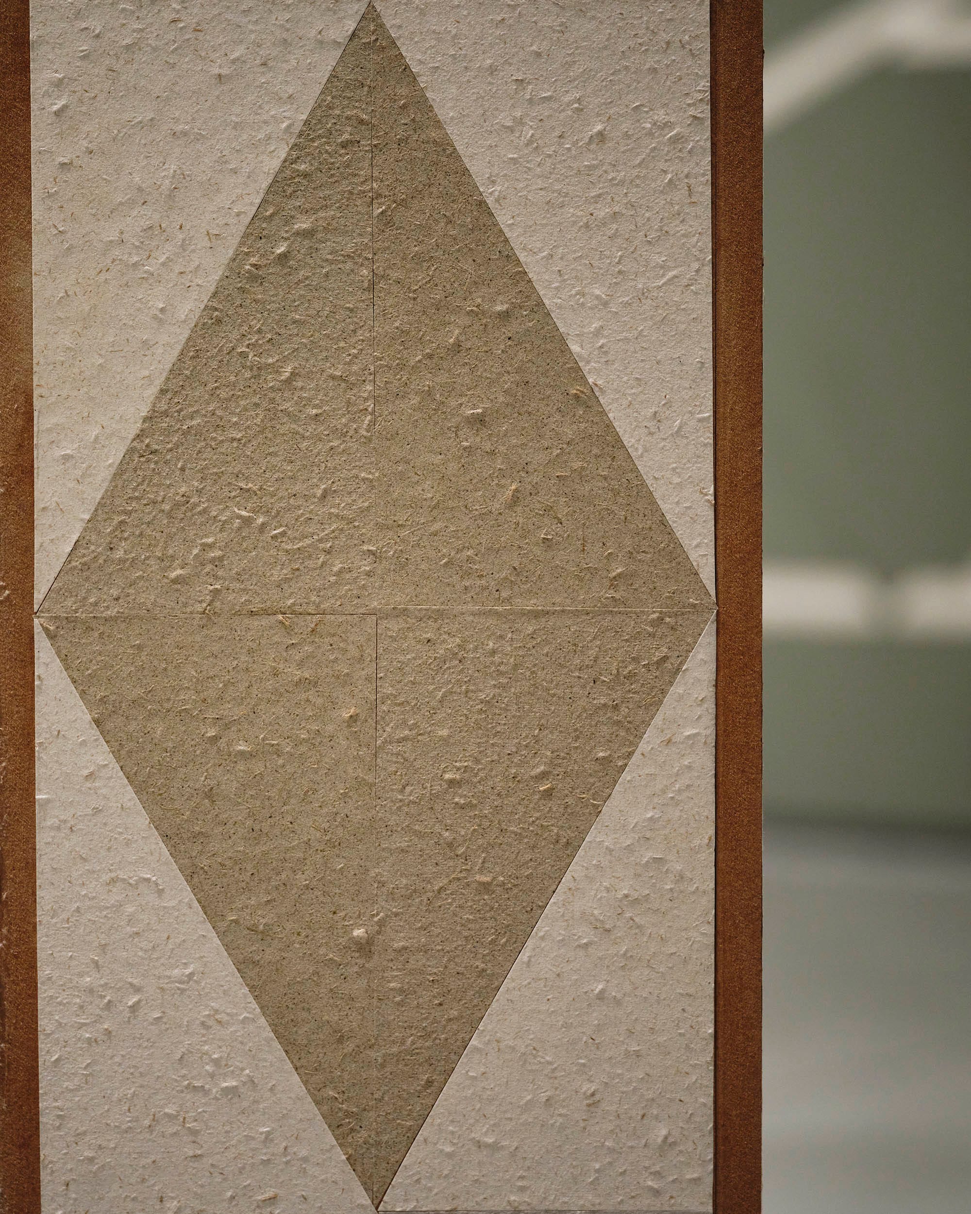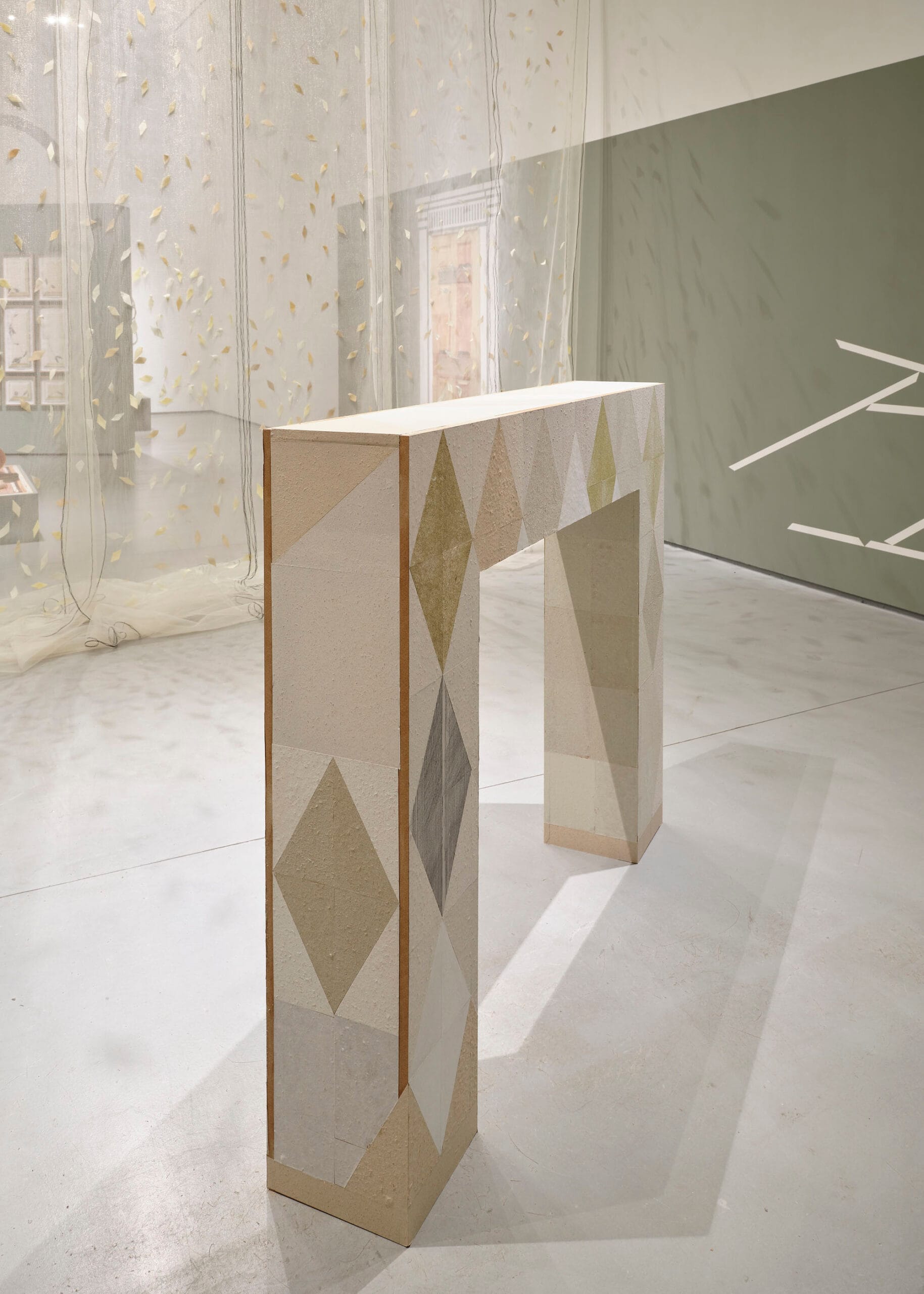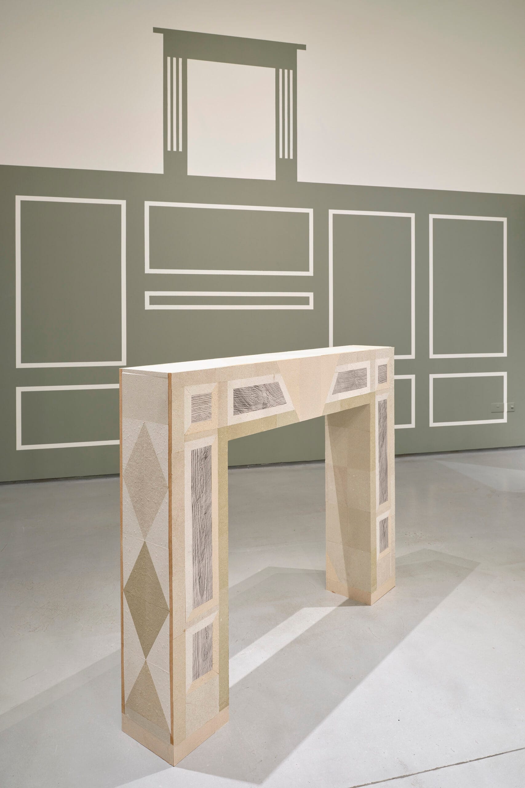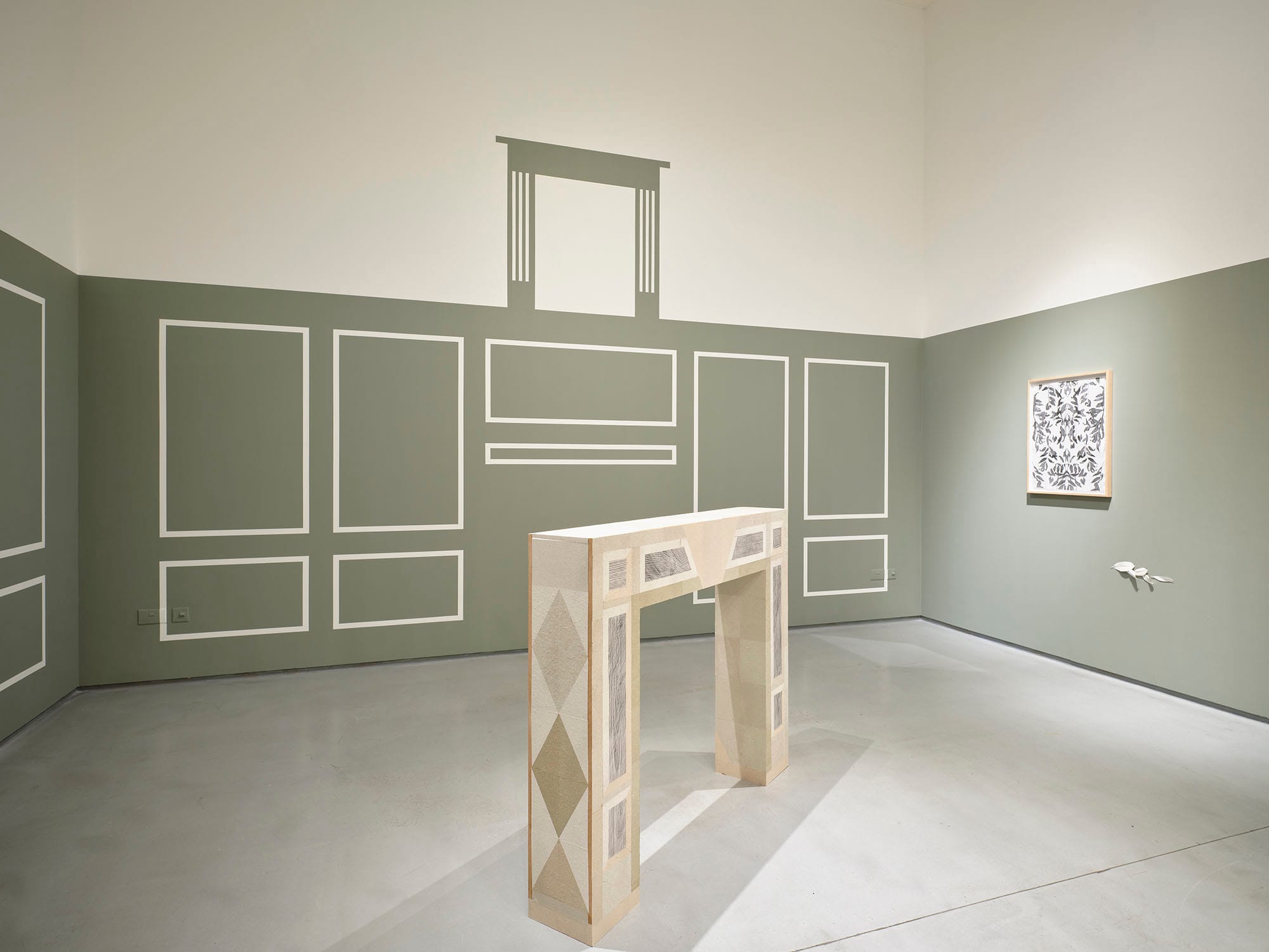 Set against a painted backdrop of wall panelling in collapse, Fireplace recalls the proportions of the George II Kilkenny fossil marble chimneypiece of the Drawing Room at Castlemorris, County Kilkenny. Only ruined outbuildings remain of the original house, the 500-acre estate now managed by Coillte and home to a Teagasc Ash gene bank monitoring the tolerance and suitability of 208 genotypes from 18 European countries to Irish climatic conditions. The laurel ornamentation of the original fireplace is reduced to diamond shapes on the artwork – a reference to the shape of lesions caused by Ash dieback disease. Deliberately exposing its MDF base to create an inverse ‘decorative trim’ from the building material (a key product of Ireland’s forestry industry) the surface of the work is ‘veneered’ with paper mementos of felled and fallen remains. Handmade paper composed of the white lab coats of scientific research, Ash woodchips salvaged from a cull of trees attributed to Health & Safety, and fallen leaves gathered from the woodland loops of Castlemorris, are pasted next to frottage of its outhouse ruins.