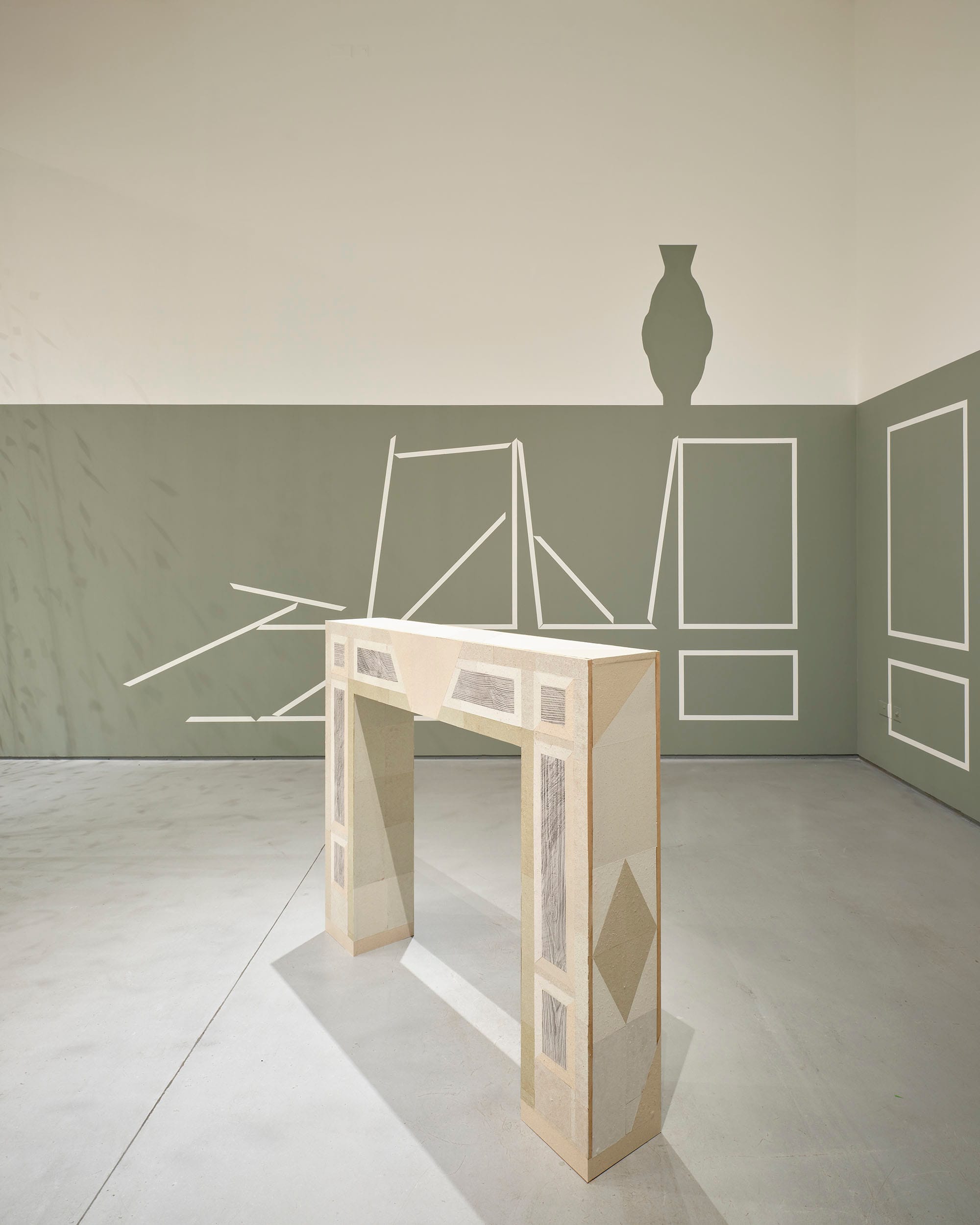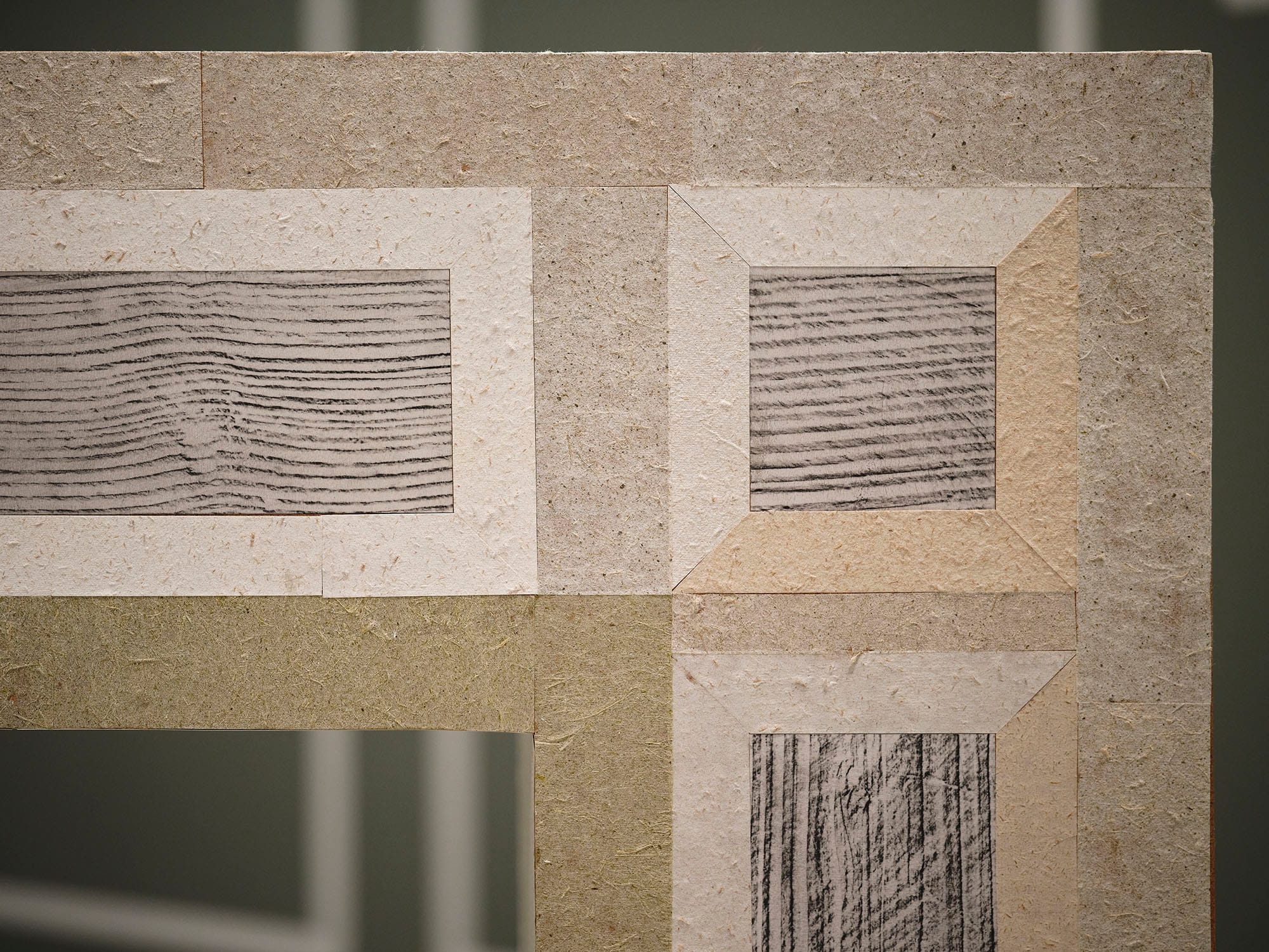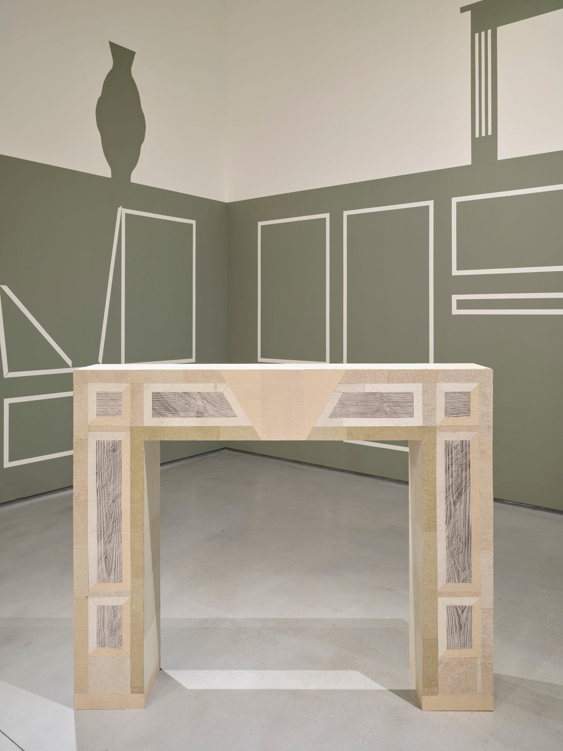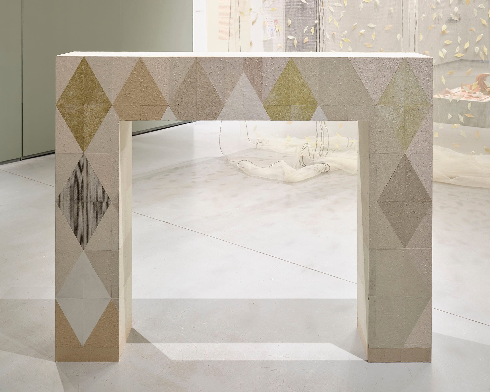 Set against a painted backdrop of wall panelling in collapse, Fireplace recalls the proportions of the George II Kilkenny fossil marble chimneypiece of the Drawing Room at Castlemorris, County Kilkenny. Only ruined outbuildings remain of the original house, the 500-acre estate now managed by Coillte and home to a Teagasc Ash gene bank monitoring the tolerance and suitability of 208 genotypes from 18 European countries to Irish climatic conditions. The laurel ornamentation of the original fireplace is reduced to diamond shapes on the artwork – a reference to the shape of lesions caused by Ash dieback disease. Deliberately exposing its MDF base to create an inverse ‘decorative trim’ from the building material (a key product of Ireland’s forestry industry) the surface of the work is ‘veneered’ with paper mementos of felled and fallen remains. Handmade paper composed of the white lab coats of scientific research, Ash woodchips salvaged from a cull of trees attributed to Health & Safety, and fallen leaves gathered from the woodland loops of Castlemorris, are pasted next to frottage of its outhouse ruins.