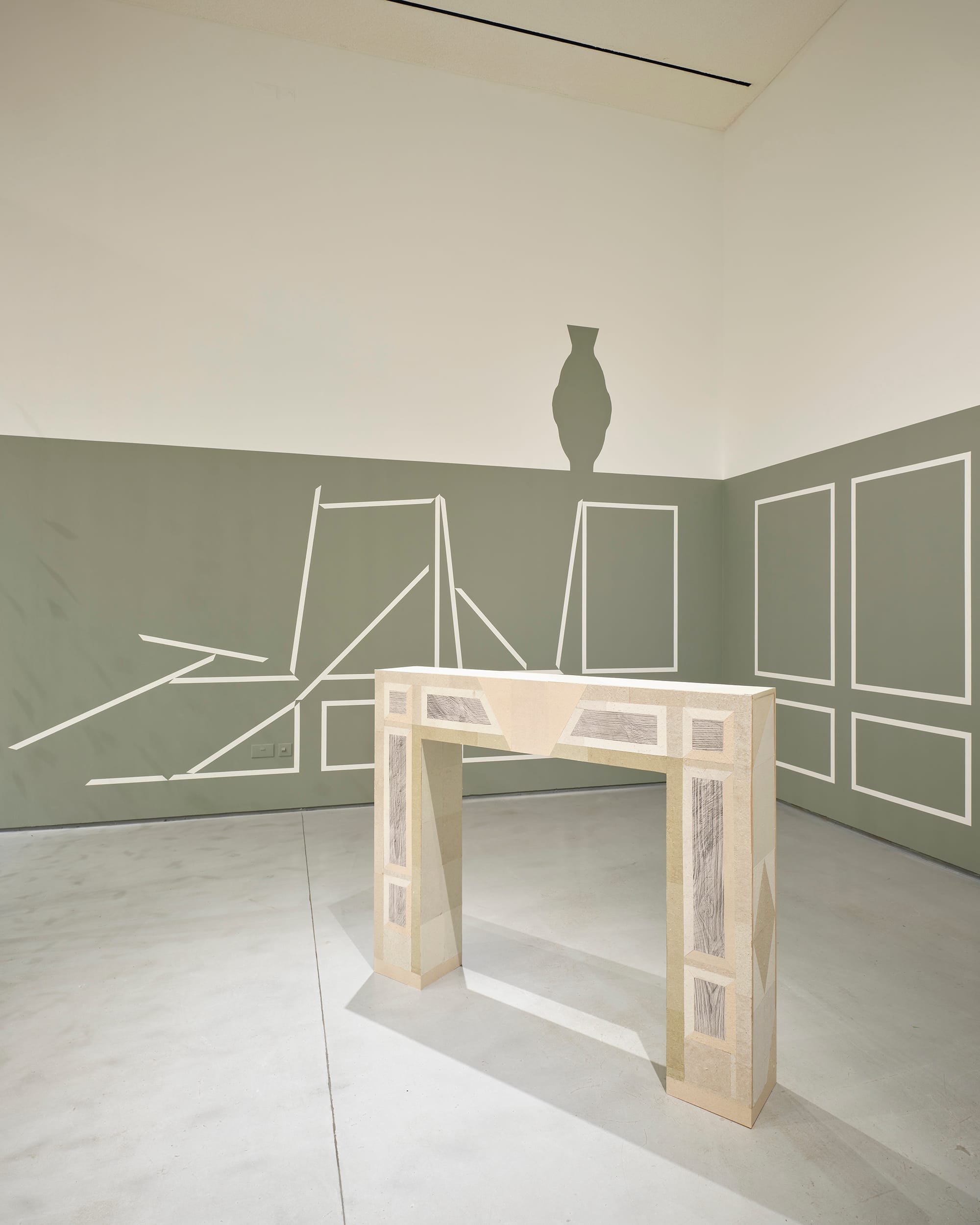 Set against a painted backdrop of wall panelling in collapse, Fireplace recalls the proportions of the George II Kilkenny fossil marble chimneypiece of the Drawing Room at Castlemorris, County Kilkenny. Only ruined outbuildings remain of the original house, the 500-acre estate now managed by Coillte and home to a Teagasc Ash gene bank monitoring the tolerance and suitability of 208 genotypes from 18 European countries to Irish climatic conditions. The laurel ornamentation of the original fireplace is reduced to diamond shapes on the artwork – a reference to the shape of lesions caused by Ash dieback disease. Deliberately exposing its MDF base to create an inverse ‘decorative trim’ from the building material (a key product of Ireland’s forestry industry) the surface of the work is ‘veneered’ with paper mementos of felled and fallen remains. Handmade paper composed of the white lab coats of scientific research, Ash woodchips salvaged from a cull of trees attributed to Health & Safety, and fallen leaves gathered from the woodland loops of Castlemorris, are pasted next to frottage of its outhouse ruins.