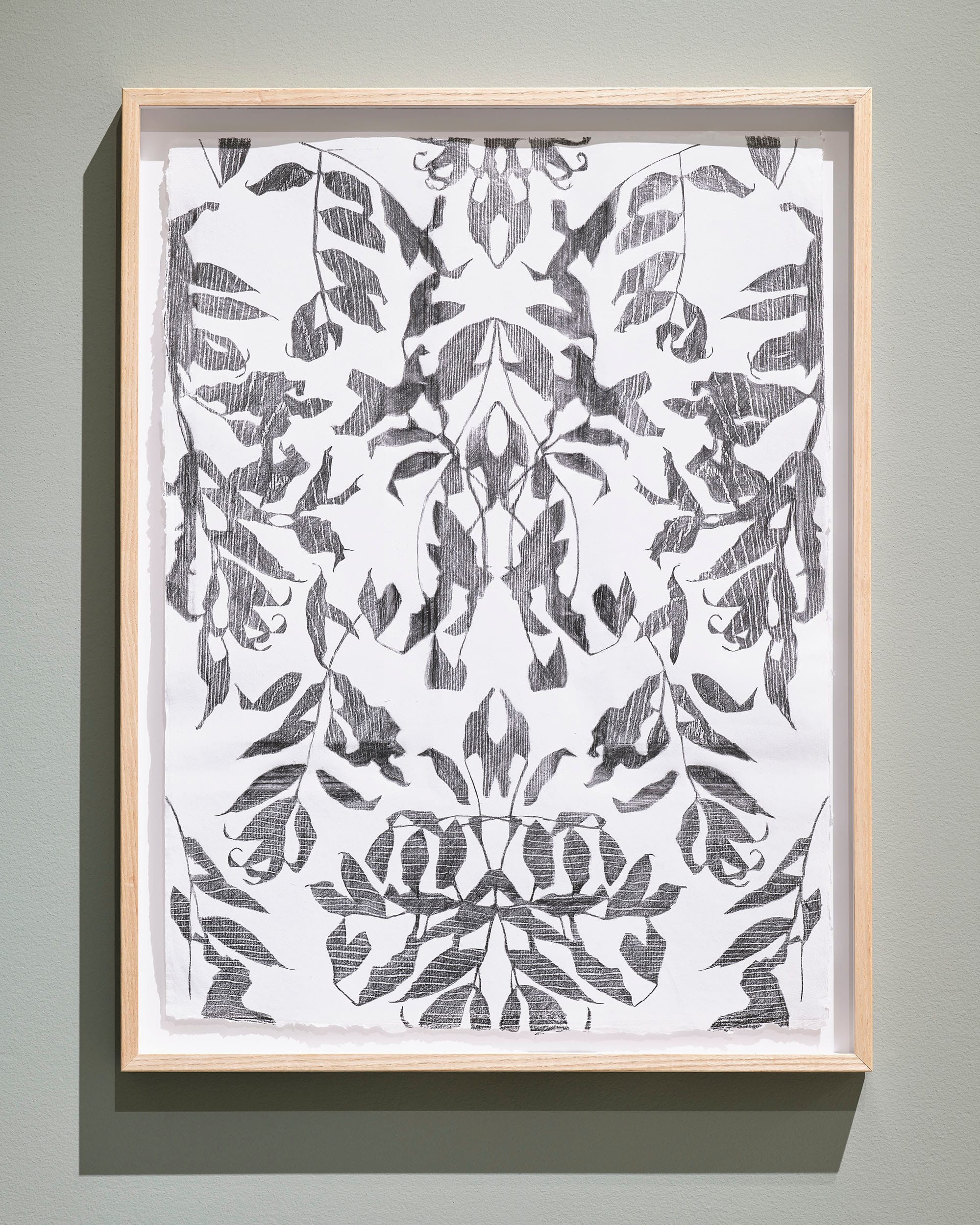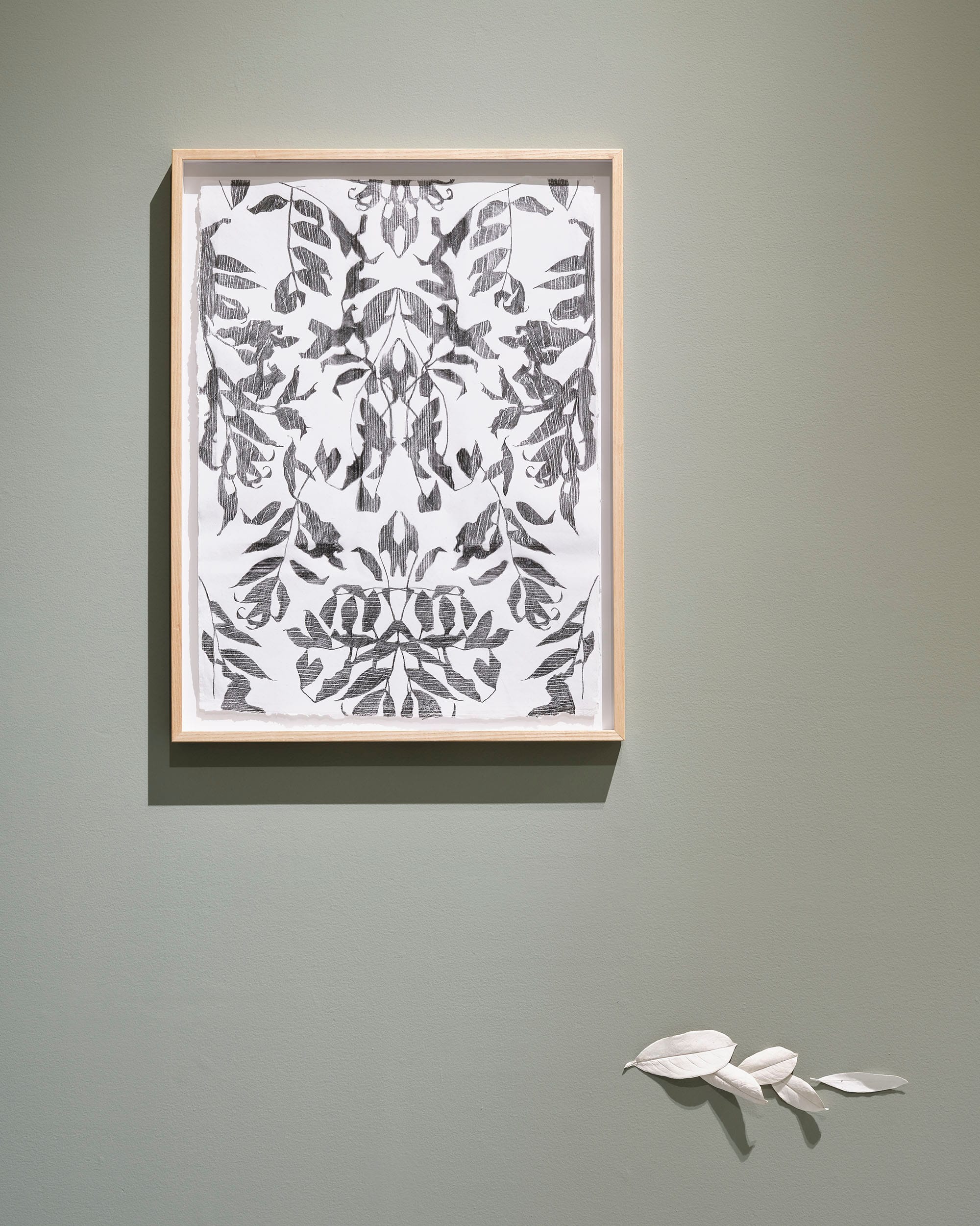 Flock proposes a wallpaper for a Drawing Room, the exotic flora of razed Georgian walls replaced with a contemporary import – the invasive fungal pathogen Ash dieback disease. Brought to Europe from Asia in the early 90s, and first detected in Ireland in 2012, it is expected to cause the death of the majority of Ireland’s Ash over the next two decades. Collecting the fallen leaves of diseased trees, I designed a pattern for repeat and used it to make a rubbing of Leitrim Textured, a mass produced door made in one of Ireland’s largest manufacturing plants in Country Leitrim where Ash dieback was first discovered on plants imported from continental Europe. Now, using genotypes from 18 European countries, Teagasc forestry researchers are working across the estates of two former Georgian homes, studying their tolerance and suitability in helping to restore Ireland’s ash. In tribute, the wood effect of Leitrim Textured is impressed on handmade paper made from the pulped lab coats of scientific research.