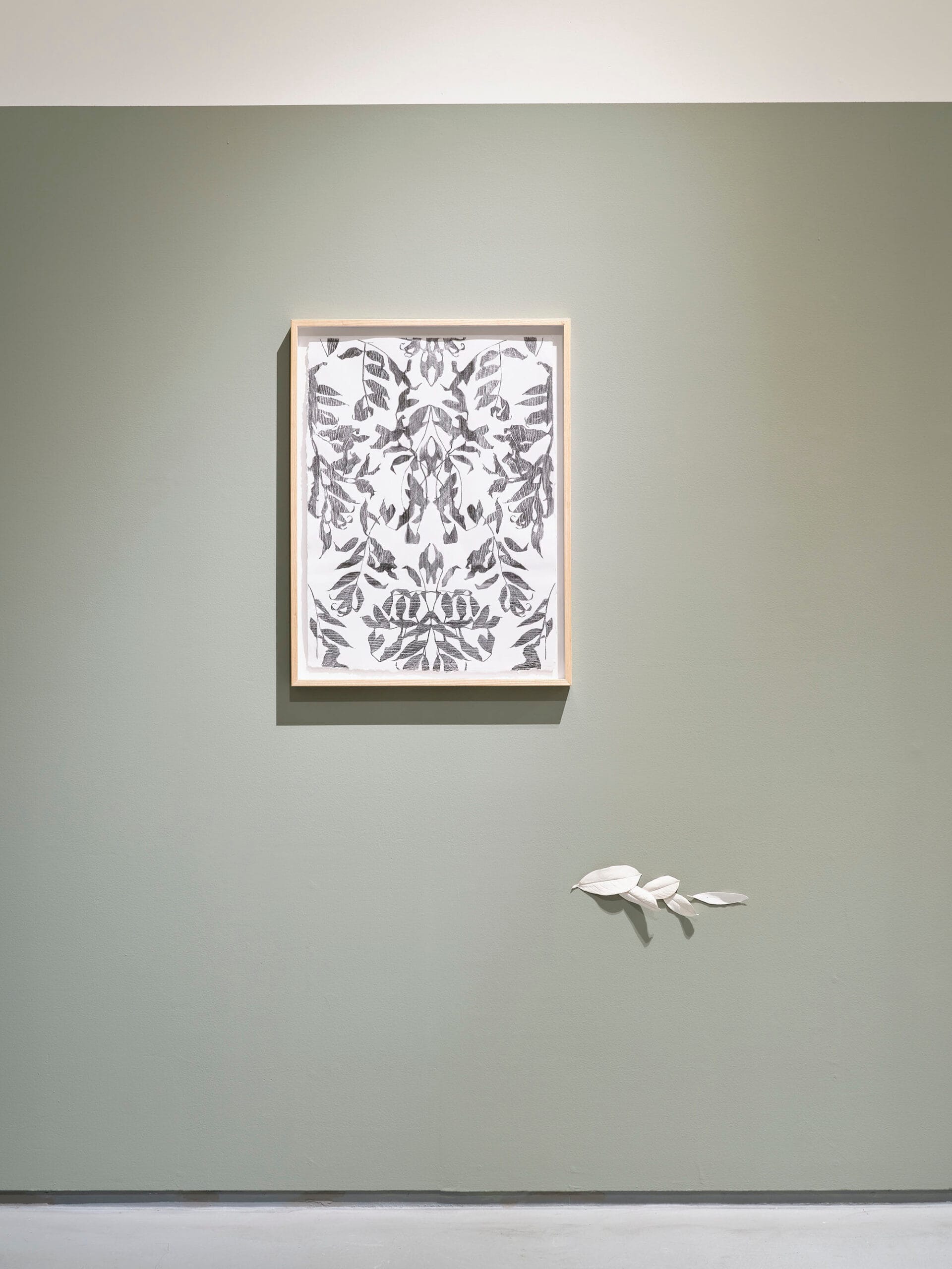 Flock proposes a wallpaper for a Drawing Room, the exotic flora of razed Georgian walls replaced with a contemporary import – the invasive fungal pathogen Ash dieback disease. Brought to Europe from Asia in the early 90s, and first detected in Ireland in 2012, it is expected to cause the death of the majority of Ireland’s Ash over the next two decades. Collecting the fallen leaves of diseased trees, I designed a pattern for repeat and used it to make a rubbing of Leitrim Textured, a mass produced door made in one of Ireland’s largest manufacturing plants in Country Leitrim where Ash dieback was first discovered on plants imported from continental Europe. Now, using genotypes from 18 European countries, Teagasc forestry researchers are working across the estates of two former Georgian homes, studying their tolerance and suitability in helping to restore Ireland’s ash. In tribute, the wood effect of Leitrim Textured is impressed on handmade paper made from the pulped lab coats of scientific research.