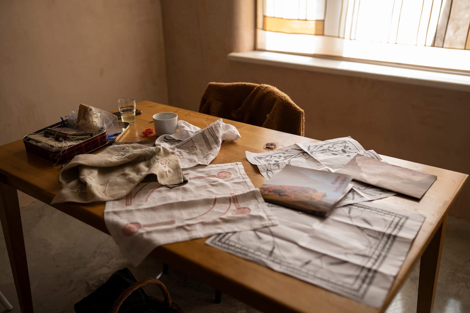 As part of my 2024 collaboration with Kunstverein Aughrim, a small team of local needleworkers was enlisted to form a ‘workforce’ to assist in the development of work for We are collecting today for tomorrow, a solo exhibition at Ethnographic Museum Zagreb following my 2023 Briefing on Soft Arts (BoSA) residency with CIMO in Zagreb. Working under the banner of Home Industries, the needleworkers met weekly around a table in my exhibition at Kunstverein Aughrim in paid embroidery shifts during the show’s run.