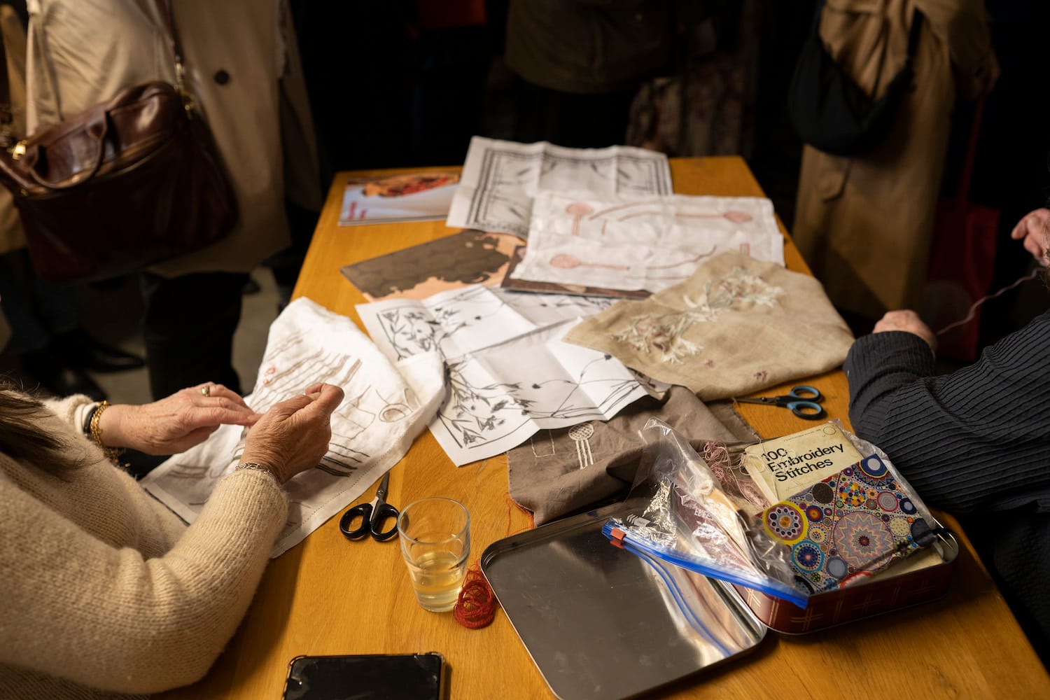 Home Industries meet for a needlework shift during Spring Preview, an open event for the exhibition To Impermanent Collections and Scattered Acquisitions at Kunstverein Aughrim in 2024. Photograph by Freddie Greenall courtesy of Kunstverein Aughrim.