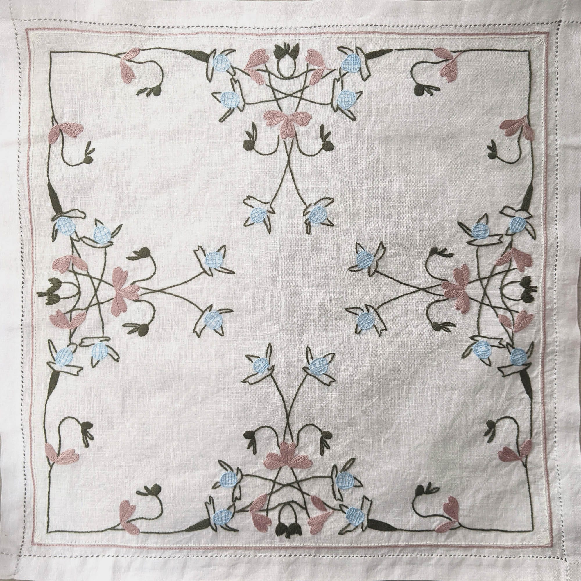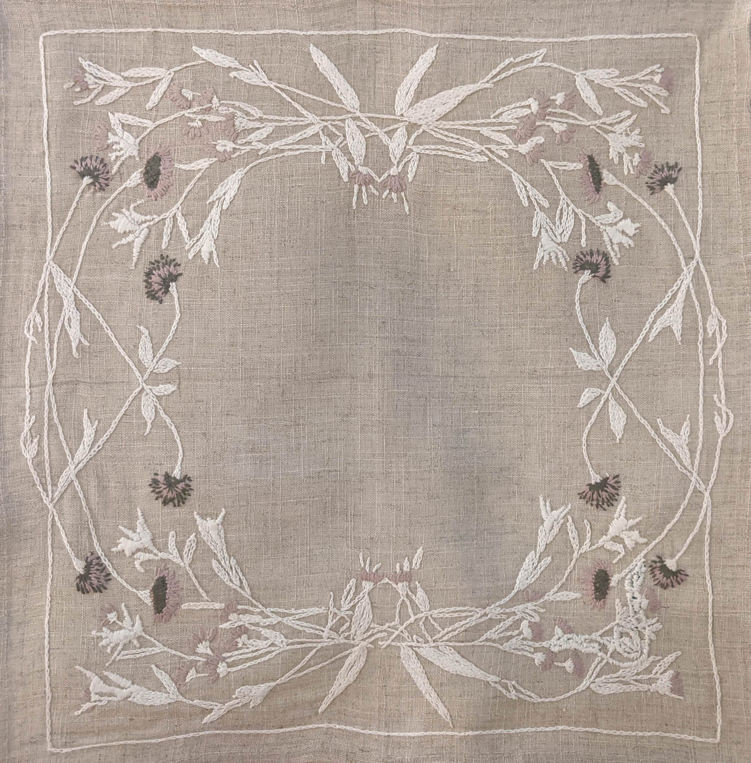 Inspired by the reflections of a museum textiles curator grappling with having sourced items of her collection from a flea market – an object’s story being integral to a museum’s preservation process – on the first day of my BoSA residency, I walked out to Hrelić flea market in search of remnants of Zagreb’s razed garment factories. Picking and pressing wildflowers on my route to Hrelić sought to commemorate the journey of the textile relics from once prosperous production lines. Their sharp decline and ensuing bankruptcy had followed privatisation in the break-up of Yugoslavia. Factories were gutted almost overnight, and little was preserved of a booming textiles industry, least of all in Croatia’s State Archives. Combining the shapes of shadows cast by the exterior ornamentation of this building with the outlines of the pressed wildflowers, a set of four handkerchiefs were among the ‘products’ I designed for Home Industries to embroider. Using the unpicked threads of souvenir tablecloths from Croatia, they embroidered souvenir linen handkerchiefs bought in Irish tourist shops. The Keepsake series is at once homage to former communities of socialist labour and museum collections of fading skills, whilst also raising questions about what is preserved and promoted of a nation’s identity.