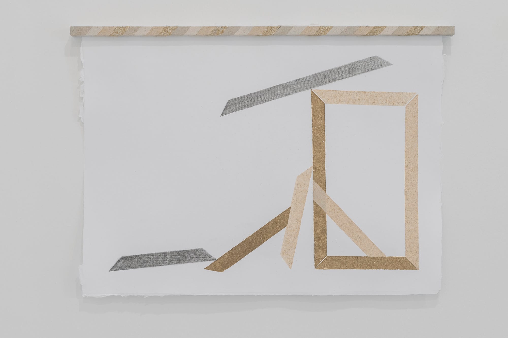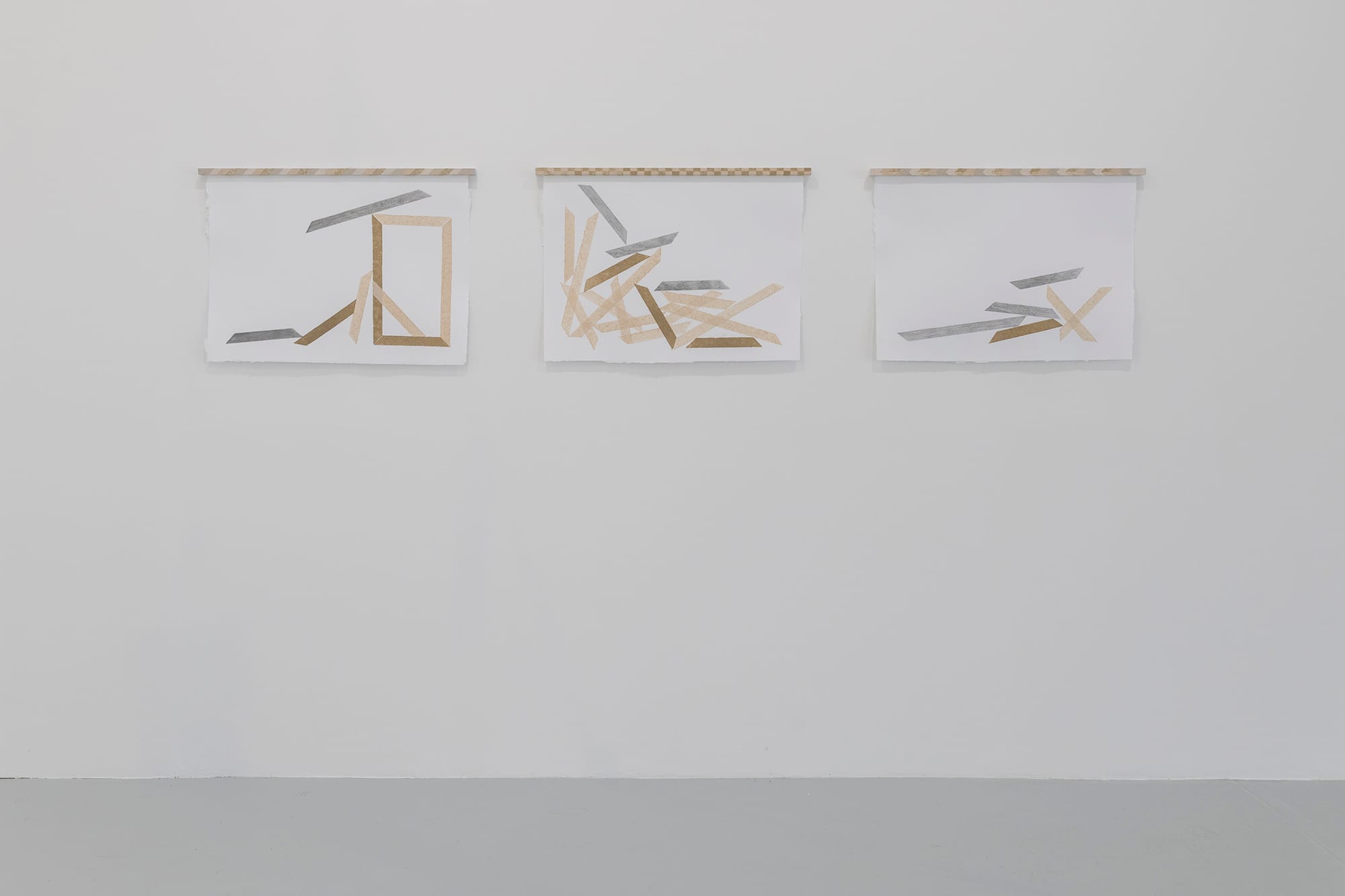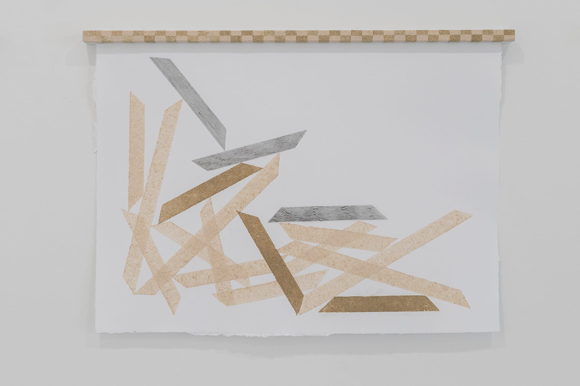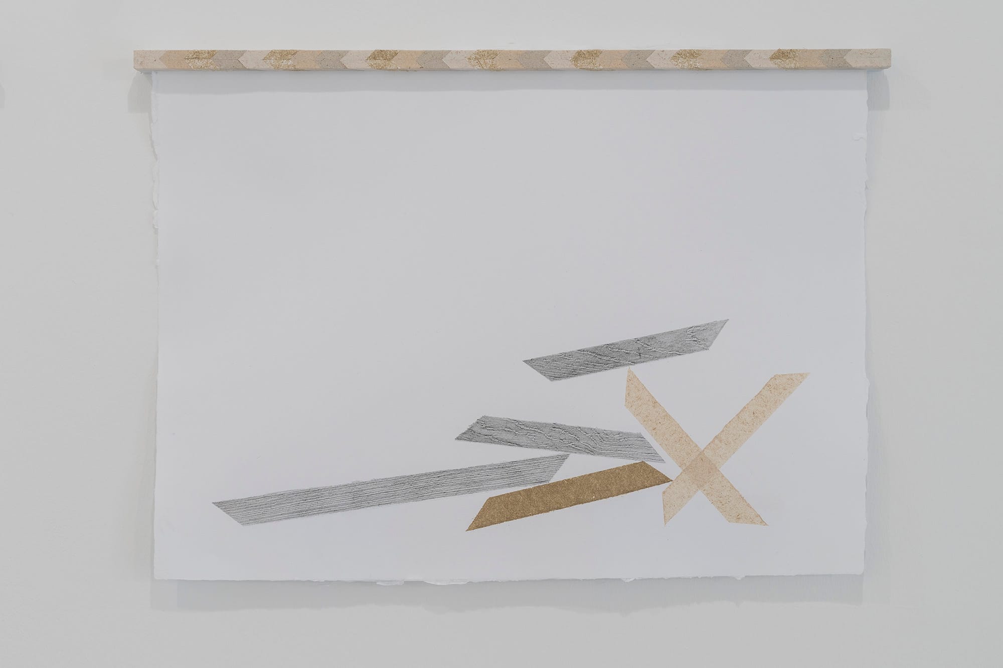 In the first works of the series, OPENINGS (Ends.) Leitrim Textured I-III, the recurring bevelled motif and concept of ‘openings’ is suggestive of both storm debris and the felling of trees for use in construction. Slivers of handmade paper were cut and pasted to the wooden batons used to hang the artworks – the fallen remains of trees with an imported disease emulating the decorative veneers normally made of imported exotic wood.