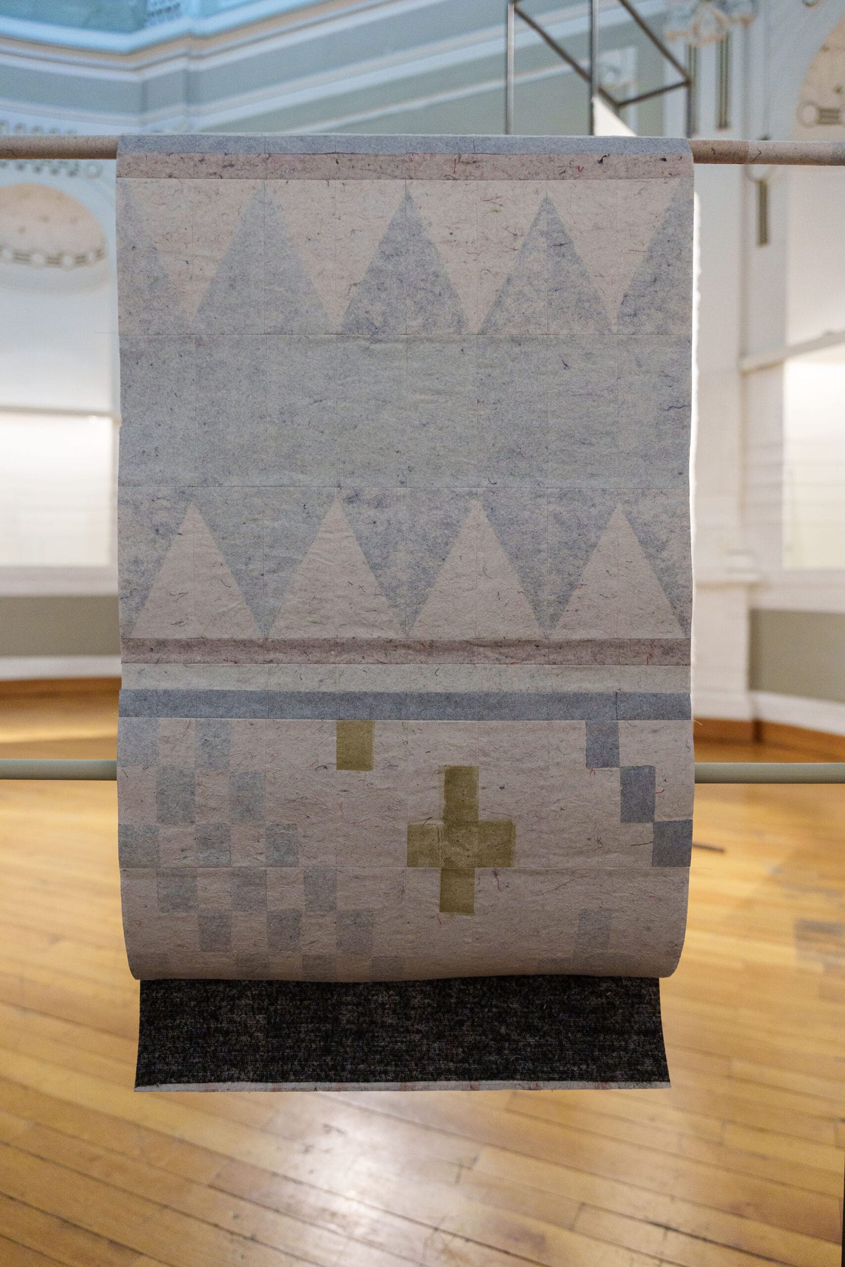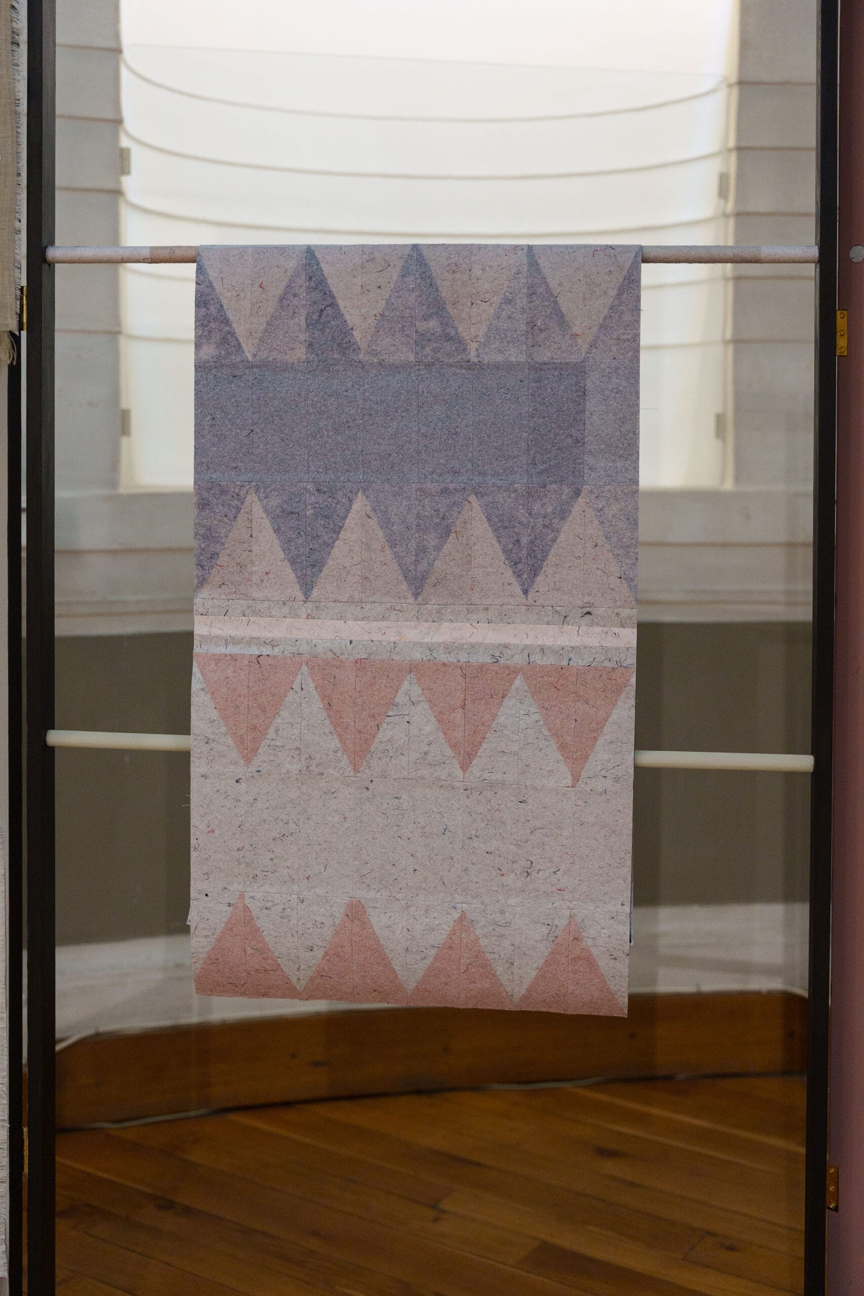 Employing papermaking processes to blend the workwear of the museum conservator – the white workcoat – with the treads of unpicked souvenir table linen and the ‘remains of the remains’ salvaged from sites of industrial textile production and circular economy, Runner hangs from a frame resembling a clothes drying rack. Derived from the woven pattern of traditional Croatian table linen, it incorporates the fibres of flea market relics from a once booming industry and grass collected from the site of the Kamensko workers’ hunger strike.