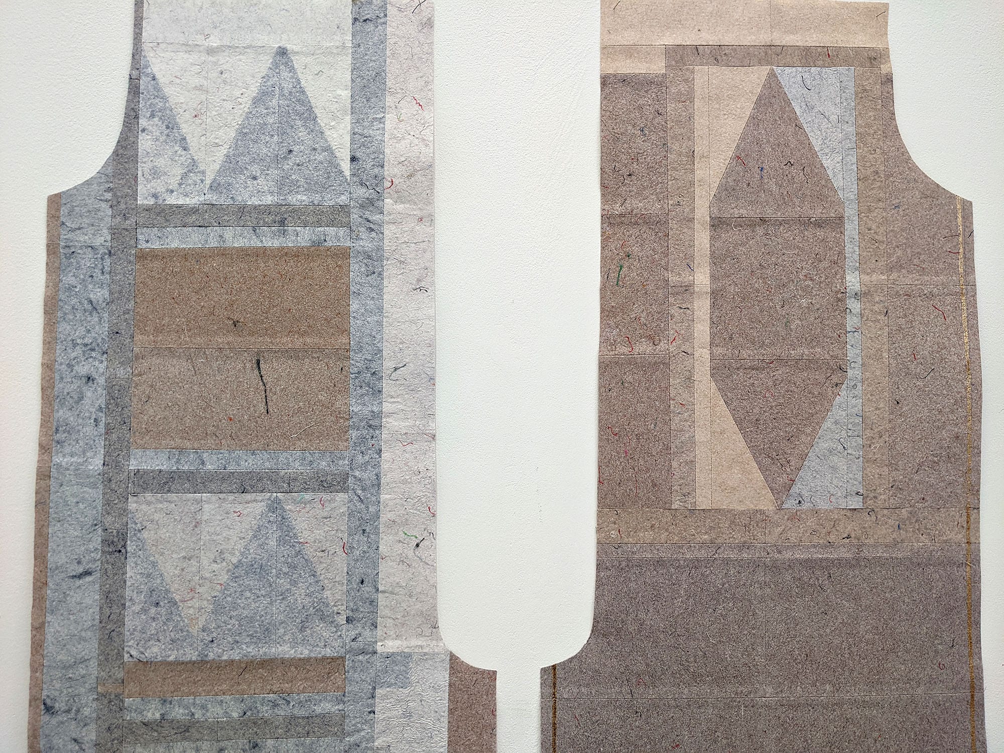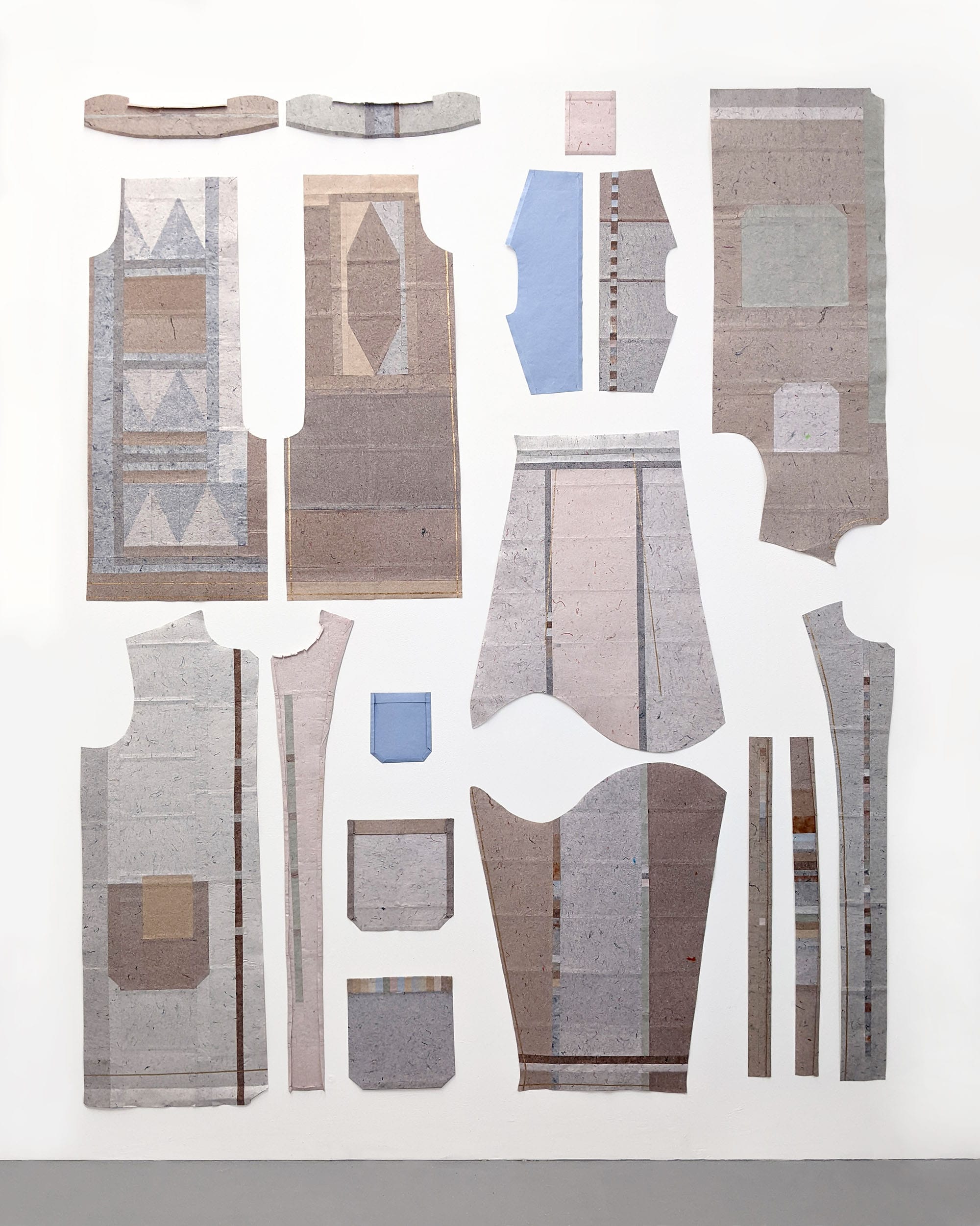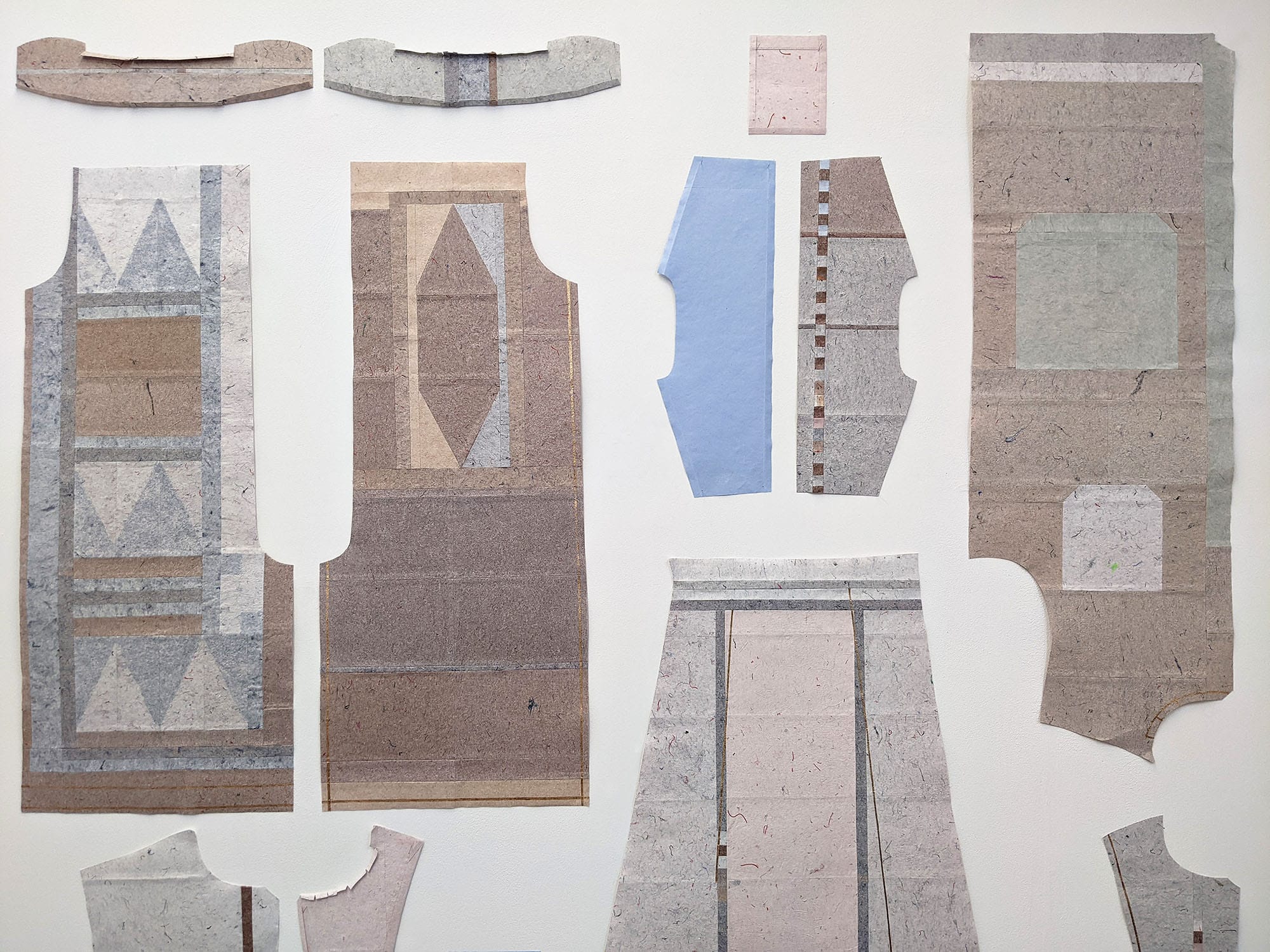 A dissected white cotton workcoat, the workwear of the museum textile curator or conservator, is reconfigured using papermaking processes and reclaimed textiles. The workcoat is first used to cut a pattern, then pulped, blended and reformed with fibres from a nurse’s uniform, flea market finds, souvenirs, and substandard products. Assembling the coloured swatches according to the pockets, seams, and fastenings of the workcoat, the patchworked fragments resemble architectural mosaic, with fine lines of rose gold following the unpicked garment’s folds like the brass inlay of terrazzo. Arranged as excavated artefacts, these are pinned like specimen to museum boards.
