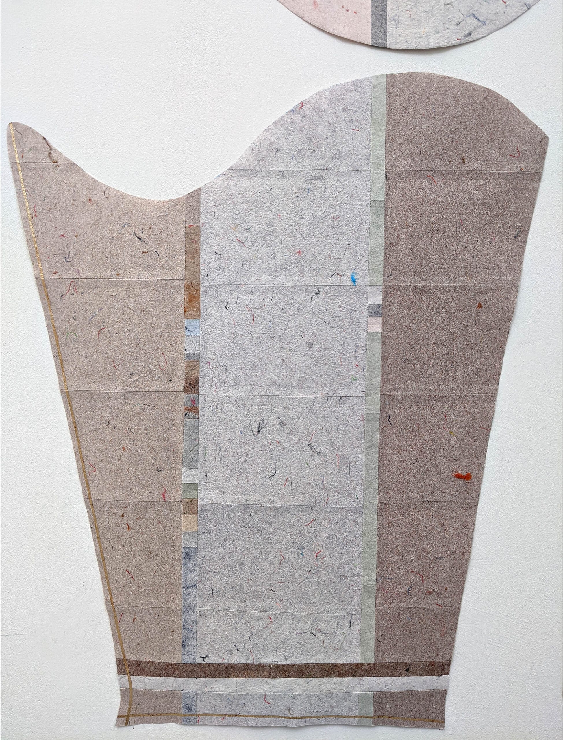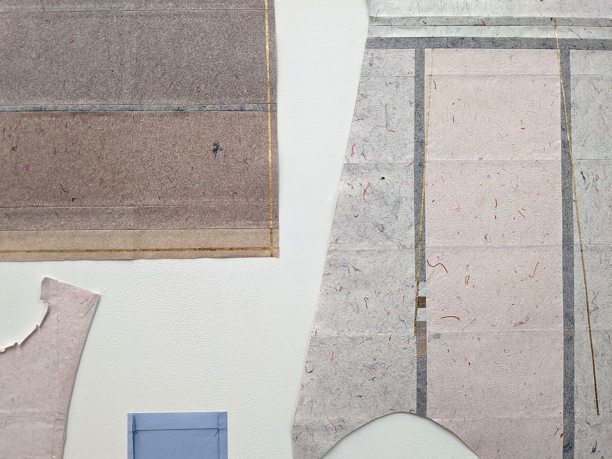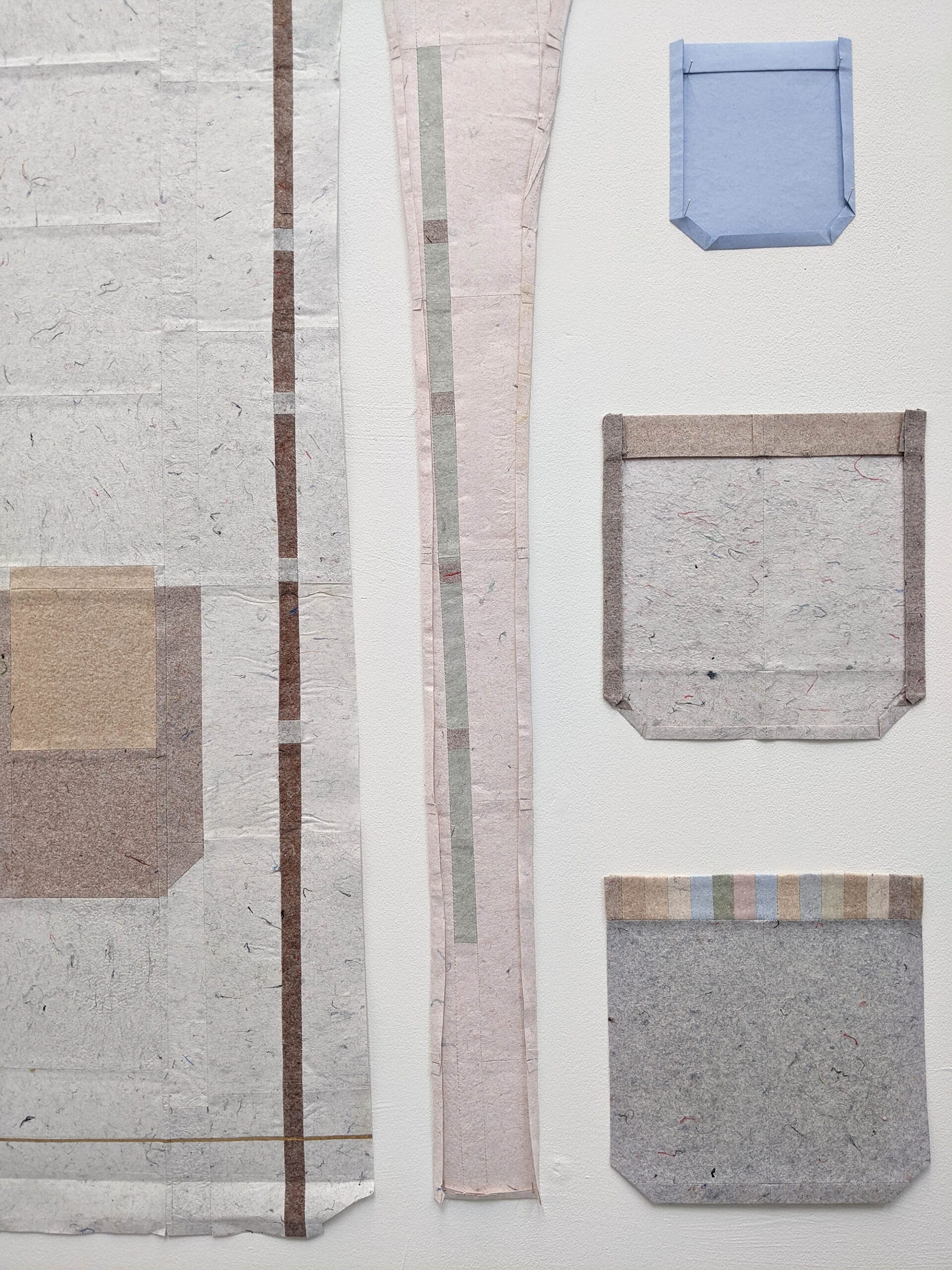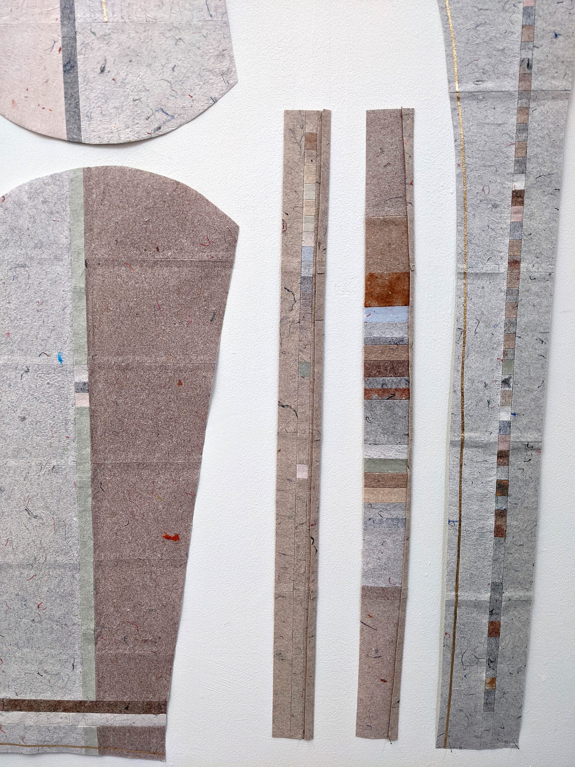 A dissected white cotton workcoat, the workwear of the museum textile curator or conservator, is reconfigured using papermaking processes and reclaimed textiles. The workcoat is first used to cut a pattern, then pulped, blended and reformed with fibres from a nurse’s uniform, flea market finds, souvenirs, and substandard products. Assembling the coloured swatches according to the pockets, seams, and fastenings of the workcoat, the patchworked fragments resemble architectural mosaic, with fine lines of rose gold following the unpicked garment’s folds like the brass inlay of terrazzo. Arranged as excavated artefacts, these are pinned like specimen to museum boards.