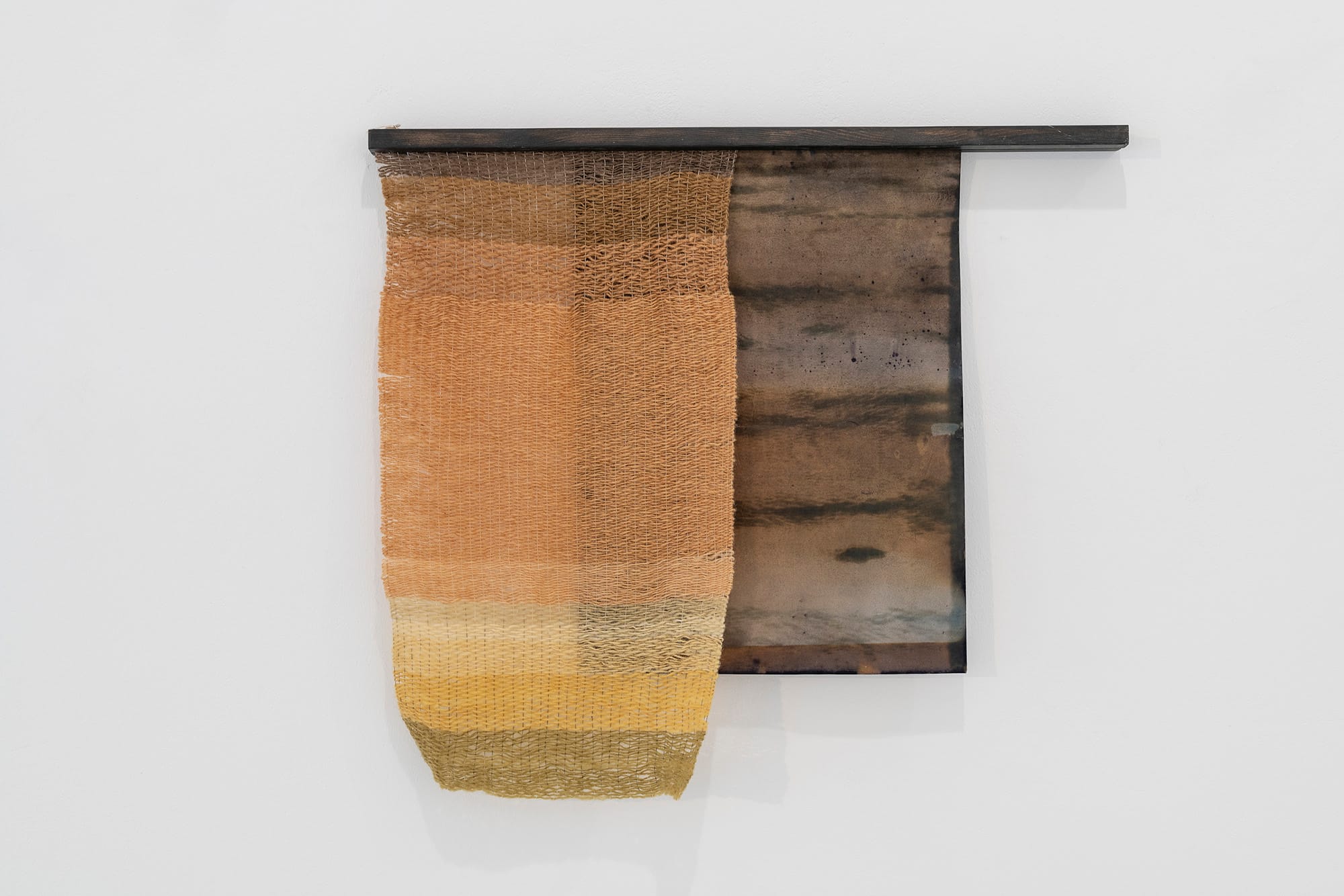 wool, linen, silk, woodland dyes (oak, birch, ivy, cherry laurel, laurel, rhododendron, bracken), mordants, cyanotype print, oak gall ink, iron, ivy vine, ESB ducting coupler, newsprint, graphite, wood, MDF, ink, wood stain, wood dye, polish