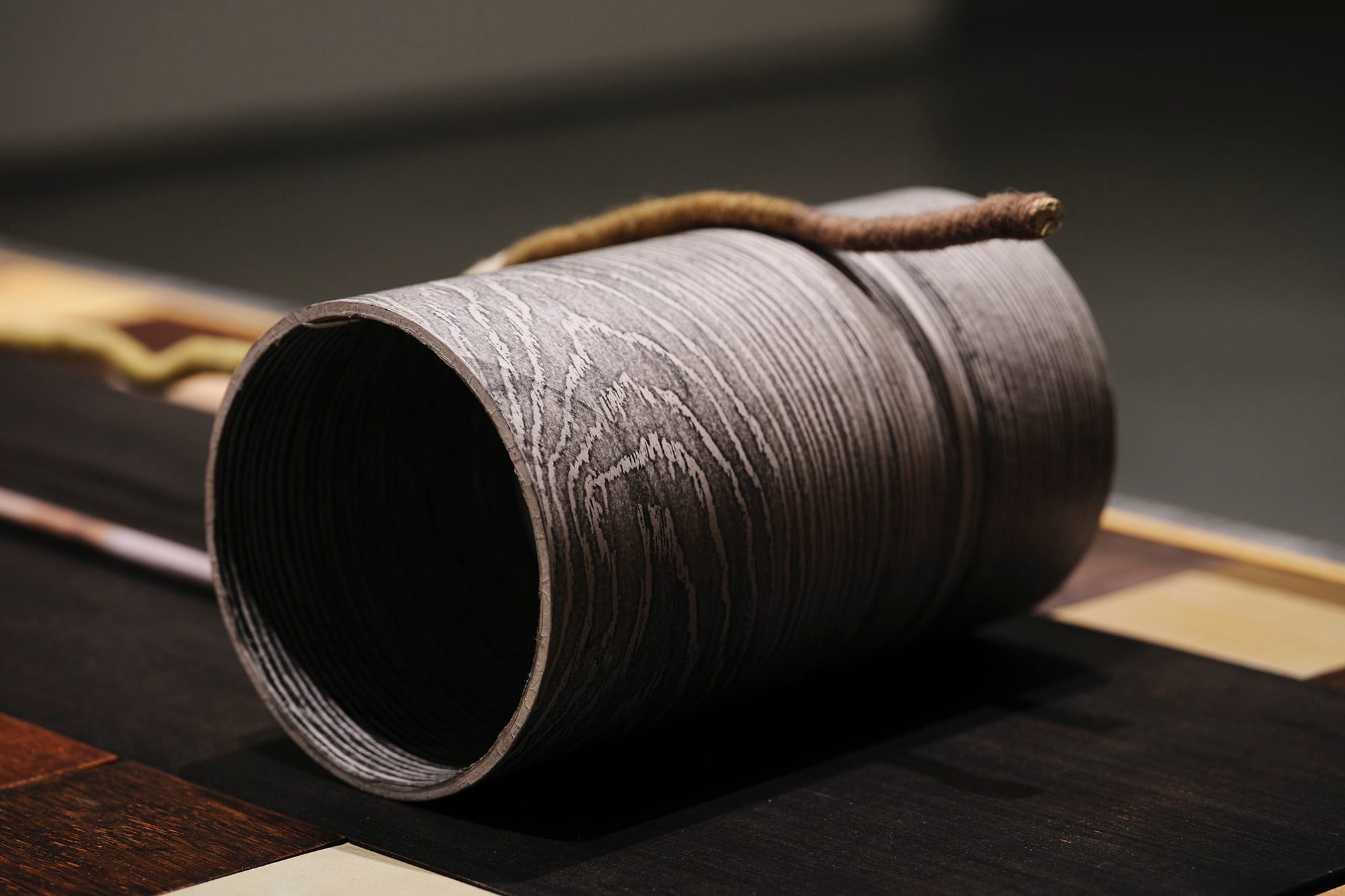 Translating the competition for light in a forest, Understory employs natural dyes made from forest-dwelling plants reputed to dominate. A weaving made from wool dyed with oak and rhododendron was used to make a cyanotype, which was then modified with oak gall ink, then pasted to a dowel. These sit on a bed of wooden tiles along with a polished ivy vine and a decoupaged ESB ducting coupler, normally used to join the red ducting arches that mark entrances to clear-fell sites. Altar-like, it’s sides are clad in graphite rubbings – the woodgrain effect lifted from a mass-produced fibrewood door, a product of Ireland’s forestry industry.